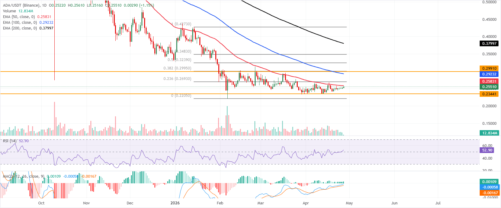 Cardano giao dịch trên mức 0,255$ vào thứ Hai sau một đợt phục hồi nhẹ vào tuần trước. ADA giữ sắc thái bị giới hạn khi giá duy trì dưới Đường trung bình động hàm mũ (EMA) 50 ngày tại 0,258$ và thấp hơn nhiều so với EMA 100 ngày và 200 ngày lần lượt ở mức 0,292$ và 0,379$.