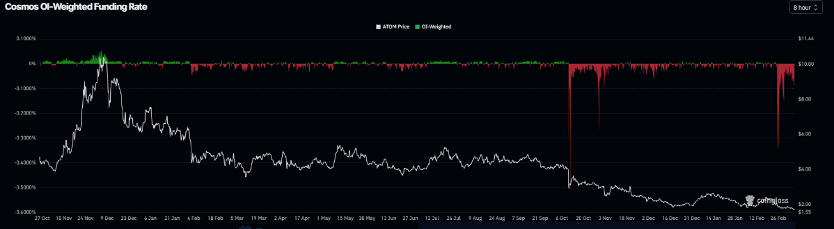 Dữ liệu phái sinh của Cosmos Hub hỗ trợ triển vọng giảm giá. Dữ liệu Tỷ lệ Tài trợ Trọng số OI của CoinGlass cho thấy số lượng nhà giao dịch đặt cược rằng giá ATOM sẽ giảm sâu hơn cao hơn so với những người dự đoán giá tăng. Chỉ số này đã chuyển sang tỷ lệ âm vào ngày 25 tháng 2 và ở mức -0,037% vào thứ Hai, cho thấy các lệnh bán khống đang trả tiền cho các lệnh mua và cho thấy tâm lý giảm giá đối với ATOM.