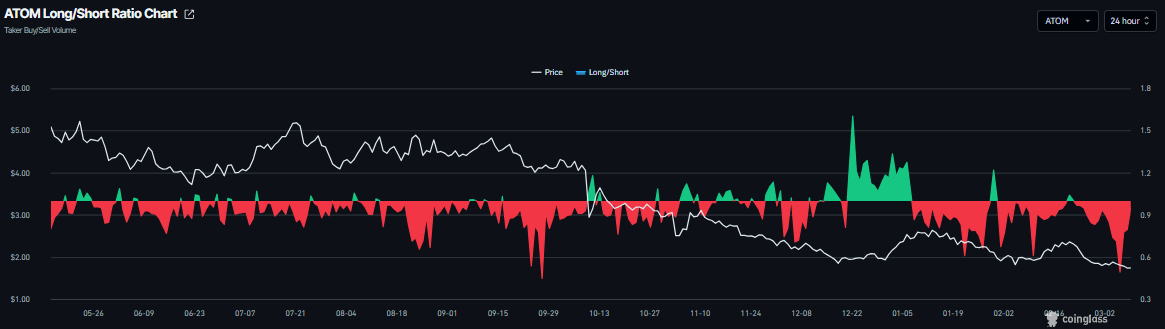 Ngoài ra, tỷ lệ mua/bán ATOM của CoinGlass hiện ở mức 0,95 vào thứ Hai. Tỷ lệ này, dưới một, phản ánh tâm lý giảm giá trên thị trường, khi ngày càng nhiều nhà giao dịch đặt cược vào việc giá tài sản sẽ giảm.
