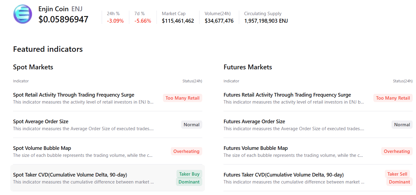 Giá Enjin Coin tăng mạnh vào đầu tháng Tư và hiện đang tạm nghỉ sau khi ghi nhận mức tăng lớn. Sự tạm dừng động lượng này cho thấy phe đầu cơ giá lên đang cạn kiệt sau đợt phục hồi mạnh. Dữ liệu tổng hợp của CryptoQuant cũng cho thấy dấu hiệu mệt mỏi của người mua, với thị trường giao ngay và hợp đồng tương lai cho thấy hoạt động bán lẻ tăng, quá nhiệt và sự thống trị của phe bán tăng lên. Những yếu tố này ủng hộ triển vọng giảm giá ngắn hạn cho ENJ.