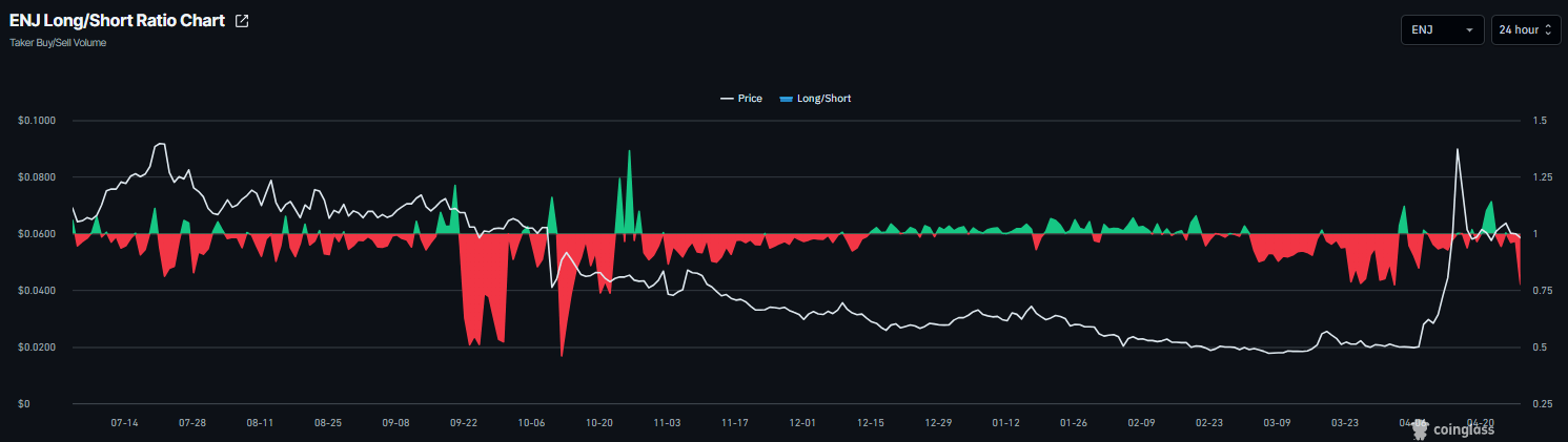 Ở phía thị trường phái sinh, các vị thế bán khống tăng cũng hỗ trợ triển vọng tiêu cực. Tỷ lệ long-to-short của ENJ trên CoinGlass ghi nhận 0,77 vào thứ Ba, gần mức thấp nhất trong hơn một tháng. Tỷ lệ dưới một cho thấy nhiều nhà giao dịch đang đặt cược giá tài sản sẽ giảm.
