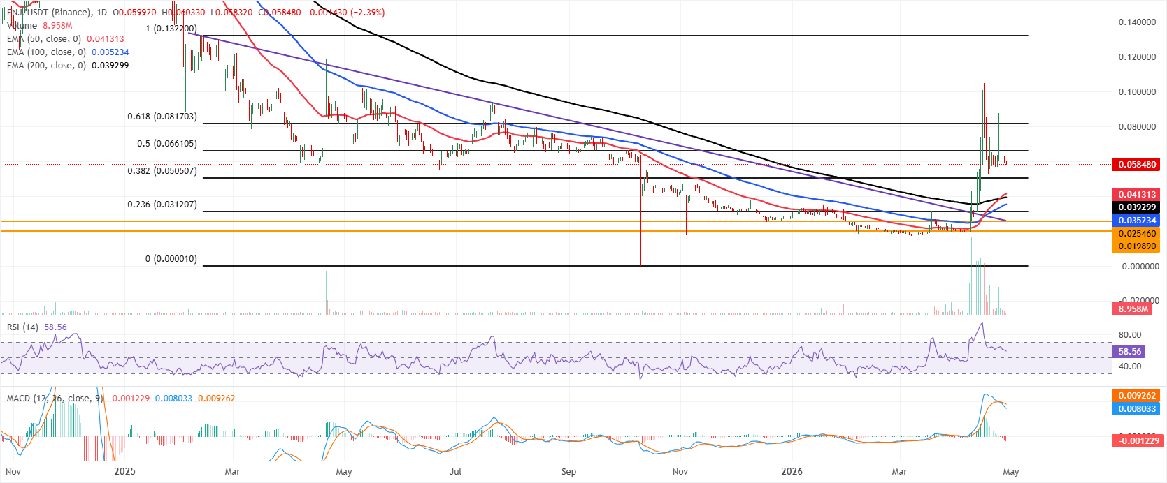 Về phía hỗ trợ, mức hỗ trợ ban đầu xuất hiện tại mức thoái lui Fibonacci 38,2% của đợt giảm gần đây quanh 0,050$, được củng cố bởi EMA 50 ngày quanh 0,041$ và sâu hơn bởi EMA 100 ngày và 200 ngày ở khoảng 0,035$ và 0,039$, tiếp theo là các vùng đệm cấu trúc tại mức thoái lui 23,6% quanh 0,031$ và vùng phá vỡ đường xu hướng trước đó cùng các mức sàn ngang giữa 0,025$ và 0,019$.