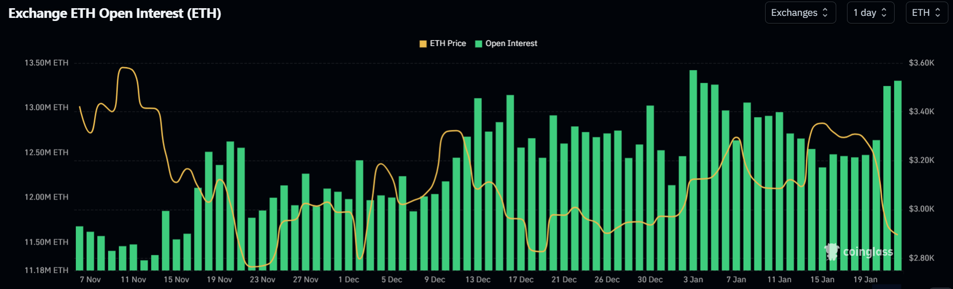 Mặc dù giá giảm, khối lượng giao dịch mở (OI) của Ethereum đã tăng từ 12,64 triệu ETH lên 13,30 triệu ETH trong 24 giờ qua.