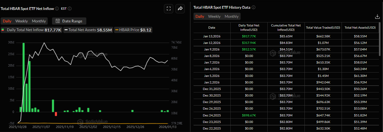 Nhu cầu từ các tổ chức đối với Hedera đã tiếp tục mạnh lên trong tuần này. Dữ liệu của SoSoValue cho thấy các quỹ ETF Hedera giao ngay đã ghi nhận dòng vốn vào 817.770 đô la vào thứ Ba, đánh dấu dòng vốn tích cực thứ ba liên tiếp kể từ tuần trước. Nếu dòng vốn này tiếp tục và mạnh lên, HBAR có thể kéo dài đà tăng giá hiện tại.