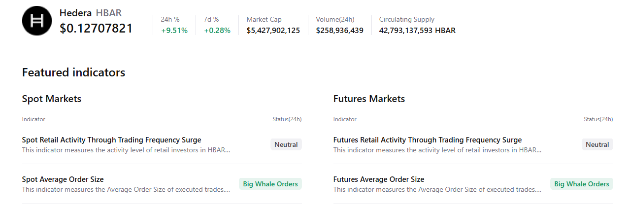 Biểu đồ CryptoQuant bên dưới hỗ trợ triển vọng tích cực, vì thị trường giao ngay và tương lai của HBAR cho thấy các lệnh lớn từ các nhà đầu tư lớn, báo hiệu một đợt tăng giá tiềm năng phía trước.
