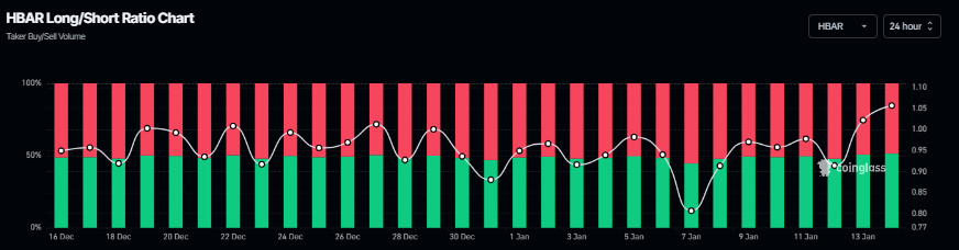 Về phía phái sinh, tỷ lệ mua/bán khống của HBAR trên Coinglass đạt 1,06 vào thứ Tư, mức cao nhất trong hơn một tháng. Tỷ lệ này, trên một, phản ánh tâm lý lạc quan trên thị trường, khi ngày càng nhiều nhà giao dịch đặt cược vào giá Hedera sẽ tăng.