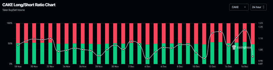 Hơn nữa, tỷ lệ mua/bán khống của CAKE là 0,92 vào thứ Tư. Tỷ lệ dưới một cho thấy tâm lý giảm giá đang gia tăng, khi các nhà giao dịch đang đặt cược vào việc giá tài sản sẽ giảm.