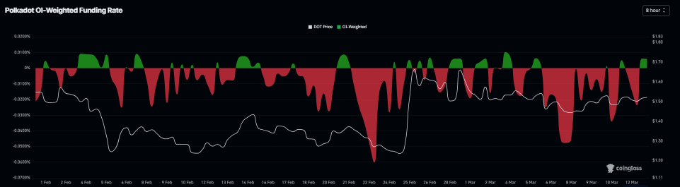 Dữ liệu về tỷ lệ phí tài trợ của CoinGlass cũng cho thấy triển vọng tích cực đối với Polkadot. Chỉ số này đã chuyển sang tỷ lệ tích cực vào thứ Năm và đạt 0,0058% vào thứ Sáu, cho thấy các vị thế mua đang trả tiền cho các vị thế bán và gợi ý tâm lý lạc quan đối với DOT.