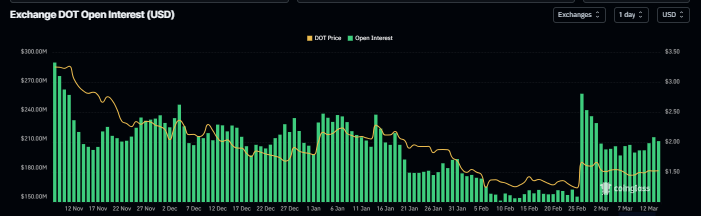 Về phía phái sinh, dữ liệu của CoinGlass cho thấy Khối lượng giao dịch mở (OI) của hợp đồng tương lai Polkadot trên các sàn giao dịch đã tăng vọt lên 256,76 triệu đô la vào ngày 26 tháng 2, mức cao nhất kể từ ngày 10 tháng 11, trước khi giảm và ổn định quanh mức 207,60 triệu đô la vào thứ Sáu. OI tăng thường cho thấy vốn mới đổ vào thị trường và hoạt động mua tăng lên, điều này có thể hỗ trợ đà tăng giá DOT hiện tại.