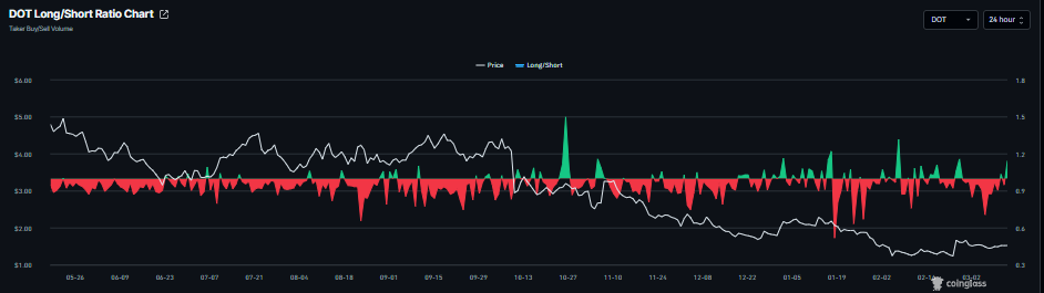 Ngoài ra, tỷ lệ mua/bán của CoinGlass đối với DOT là 1,14 vào thứ Sáu. Tỷ lệ trên một cho thấy nhiều nhà giao dịch đang đặt cược vào sự tăng giá của Polkadot.