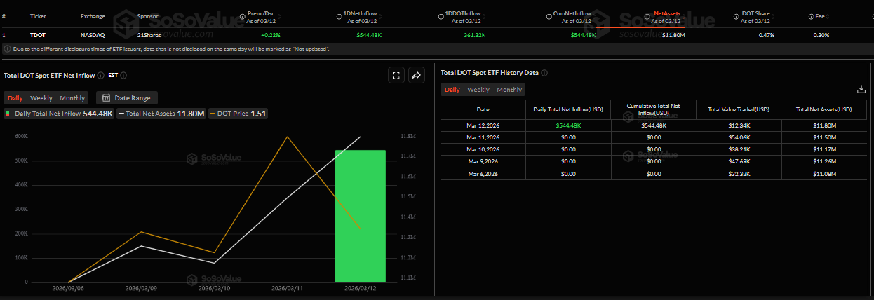 Theo dữ liệu của SoSoValue, quỹ ETF DOT giao ngay đã ghi nhận dòng vốn dương đầu tiên trị giá 544.480 đô la vào thứ Năm, báo hiệu sự quan tâm ban đầu từ các tổ chức. Nếu điều này tiếp tục và tăng mạnh, giá DOT có thể tăng trong những ngày tới.