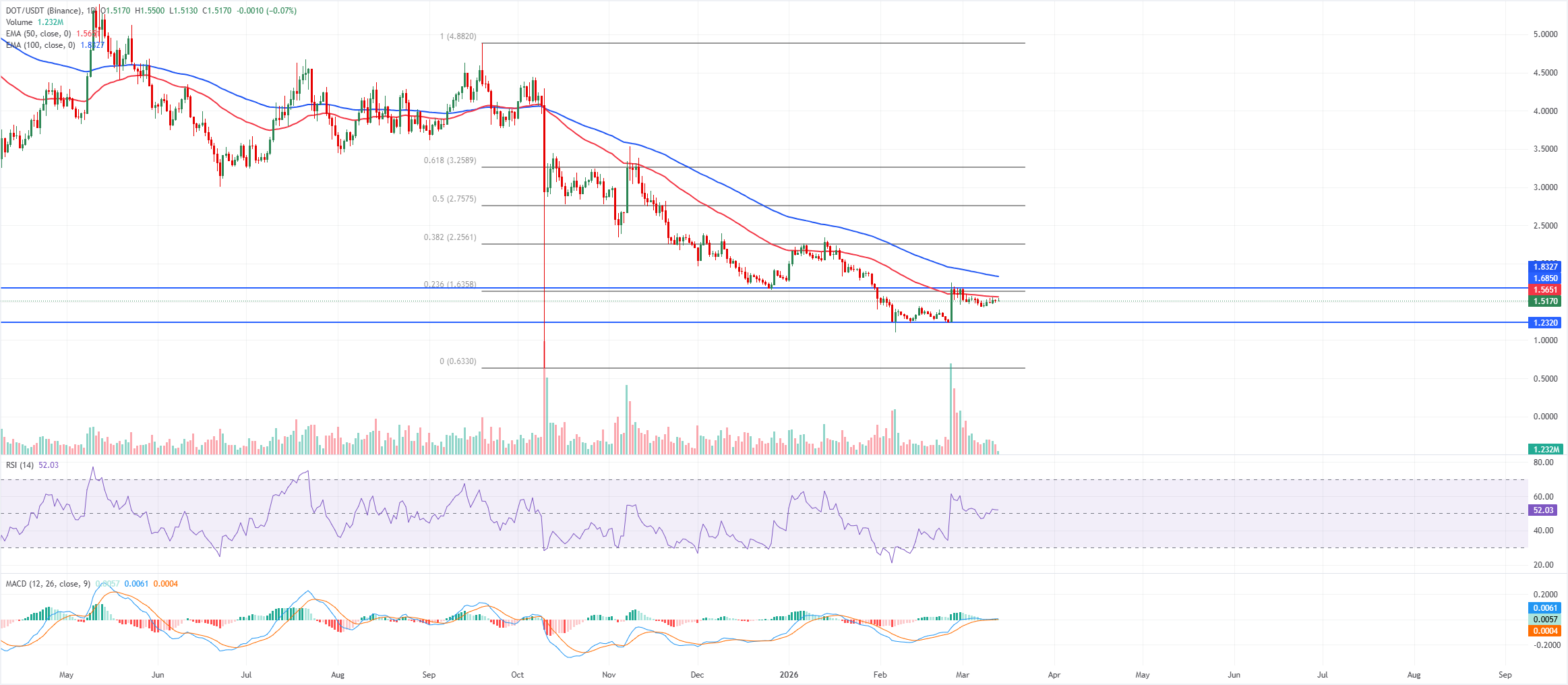 Giá Polkadot đang giao dịch ở mức 1,52 đô la vào thời điểm viết bài này vào thứ Sáu, tăng hơn 4% trong tuần này. Xu hướng ngắn hạn là trung lập với độ nghiêng tăng nhẹ khi giá giữ vững trên vùng 1,45 đô la sau đợt tăng mạnh tuần trước và củng cố dưới mức kháng cự ngang 1,68 đô la. Giá đóng cửa hàng ngày vẫn nằm dưới đường trung bình động hàm mũ (EMA) 50 ngày và 100 ngày, tập trung trong khoảng từ 1,56 đô la đến 1,83 đô la, giữ cho xu hướng giảm giá bị kìm hãm ngay cả khi áp lực giảm giá đã giảm bớt.
