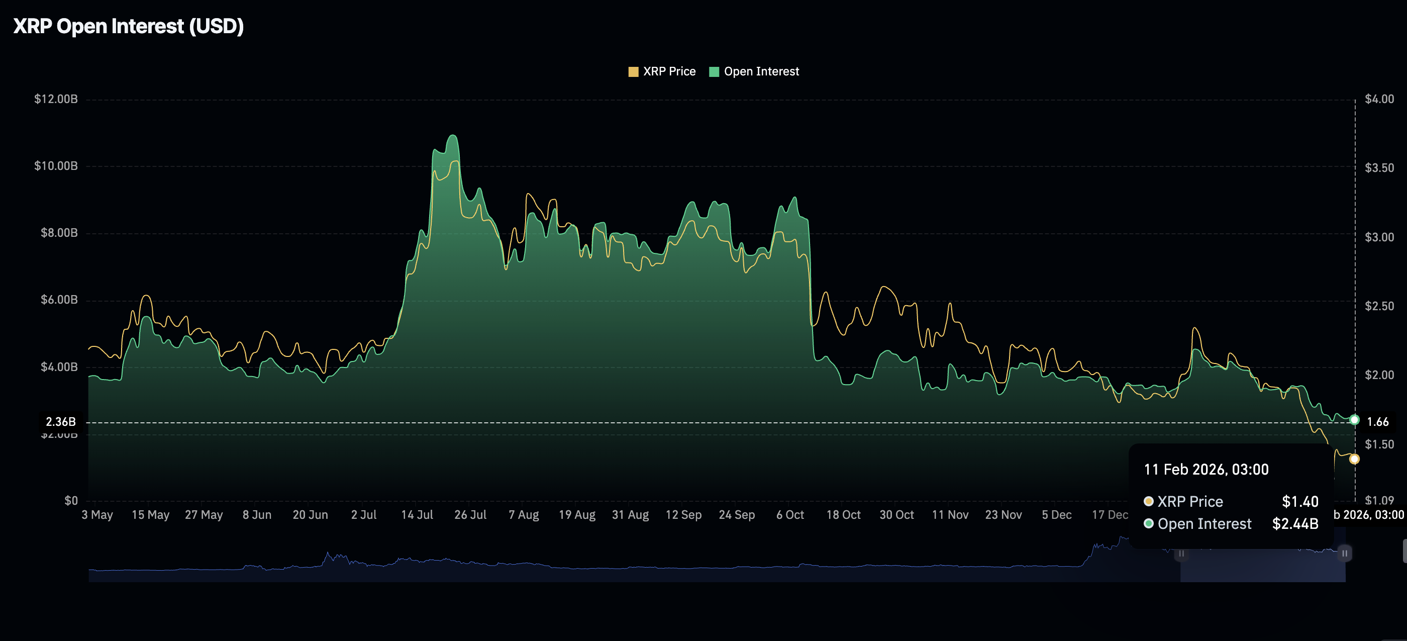 Mặc dù nhu cầu từ các tổ chức ổn định, sự quan tâm của nhà đầu tư cá nhân đối với XRP đang giảm sút, khi khối lượng giao dịch mở (OI) trên thị trường tương lai giảm xuống còn 2,44 tỷ USD vào thứ Tư, thấp hơn một chút so với 2,5 tỷ USD của ngày hôm trước. OI nhìn chung đã duy trì xu hướng giảm kể từ mức cao kỷ lục 10,94 tỷ USD vào tháng 7, cho thấy các nhà đầu tư thiếu niềm tin vào khả năng phục hồi và duy trì xu hướng tăng của XRP.