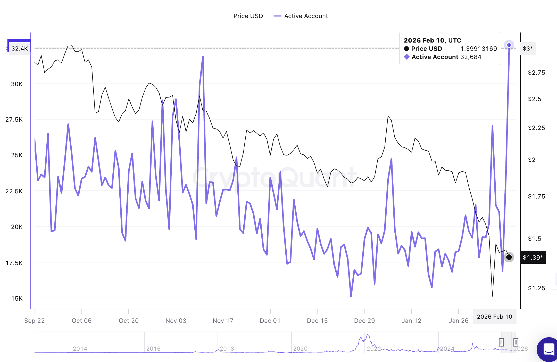Từ thứ Hai, Sổ cái XRP (XRPL) đã ghi nhận sự gia tăng đáng kể về số lượng địa chỉ hoạt động giao dịch trên chuỗi. Theo dữ liệu của CryptoQuant, chỉ số Địa chỉ hoạt động đã tăng gần gấp đôi, từ khoảng 17.000 địa chỉ vào Chủ nhật lên 32.700 địa chỉ vào thứ Tư.