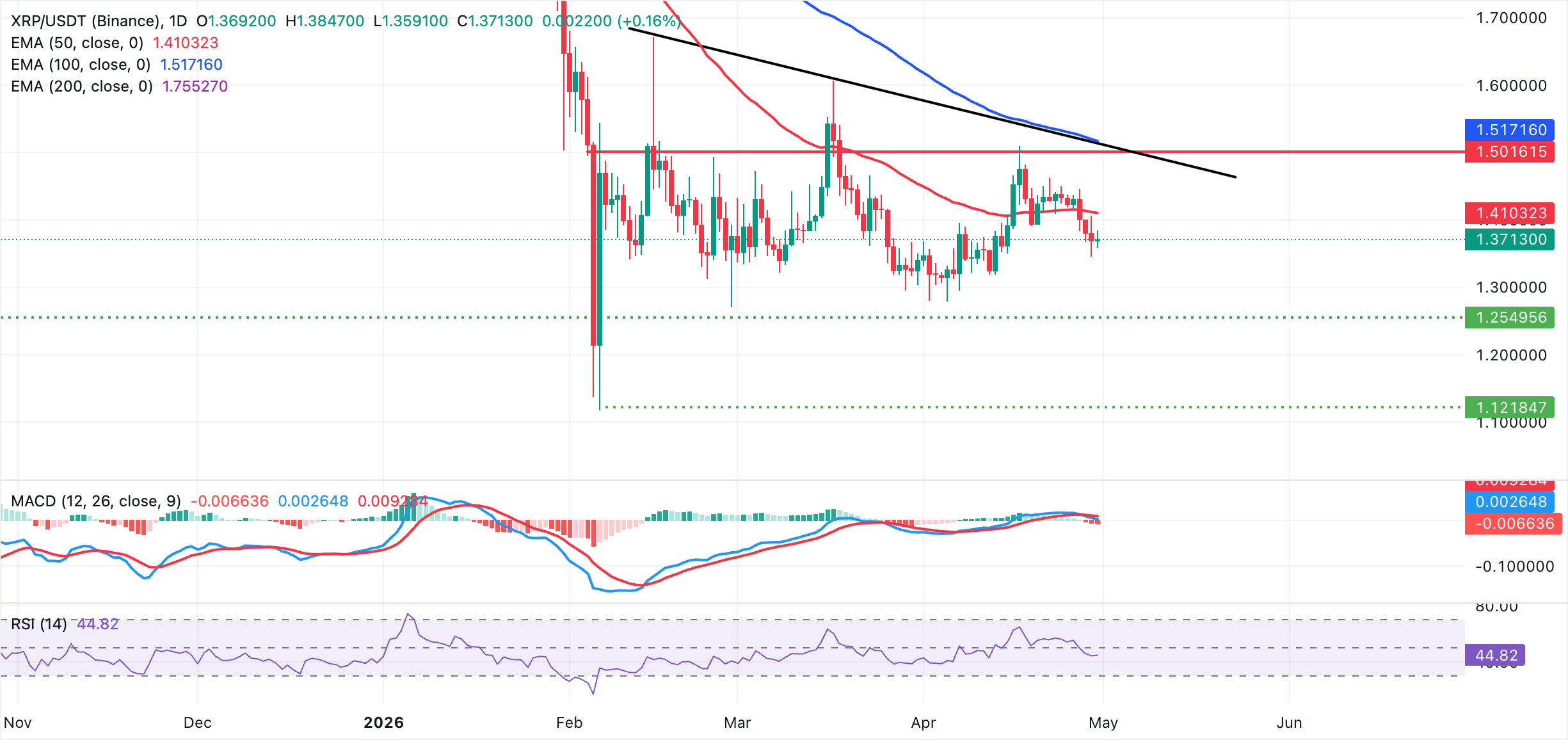 XRP giao dịch ở mức 1,37$, duy trì giọng điệu giảm giá ngắn hạn khi giá giữ dưới các đường trung bình động hàm mũ (EMA) 50 ngày, 100 ngày và 200 ngày lần lượt ở mức 1,41$, 1,52$ và 1,76$. Đường xu hướng kháng cự giảm nằm trên mức giá giao ngay và củng cố nguồn cung rộng hơn phía trên, trong khi Chỉ số sức mạnh tương đối (RSI) gần 45 trên biểu đồ hàng ngày. Biểu đồ histogram Đường trung bình động hội tụ phân kỳ (MACD) hơi tiêu cực cho thấy động lượng giảm vẫn còn nhưng chưa quá bán.