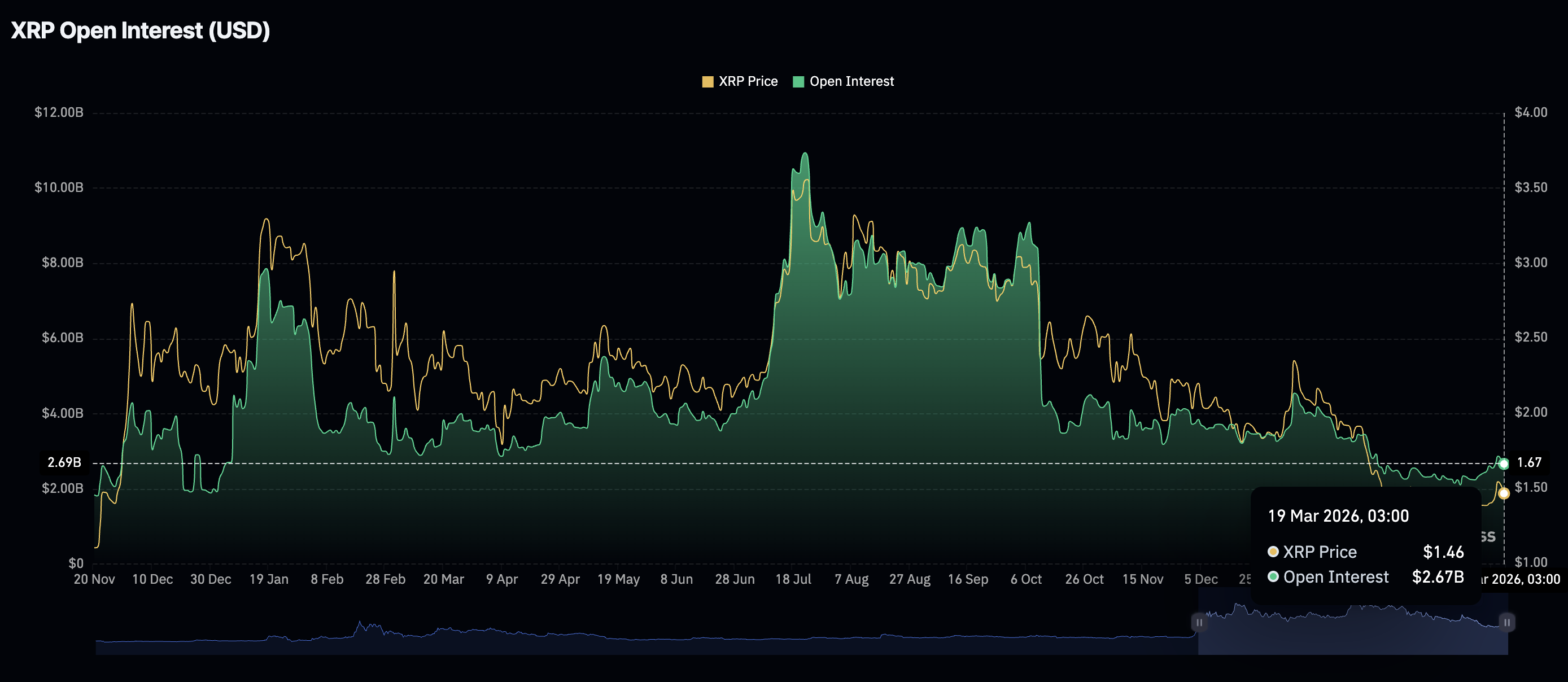 Thị trường phái sinh XRP một lần nữa phải đối mặt với sự sụt giảm hứng thú từ nhà đầu tư cá nhân, khi khối lượng giao dịch mở của hợp đồng tương lai, phản ánh giá trị danh nghĩa của các hợp đồng tương lai đang lưu hành, giảm xuống còn 2,67 tỷ đô la vào thứ Năm từ 2,79 tỷ đô la ngày hôm trước.