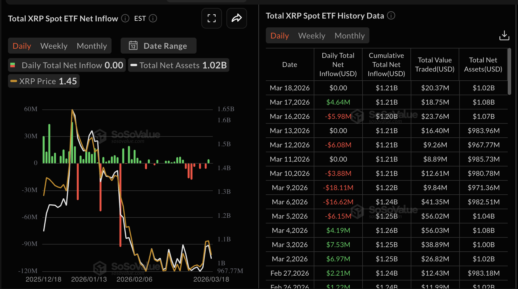 Sự quan tâm từ các tổ chức vẫn còn bấp bênh, được phản ánh qua hoạt động trầm lắng của các quỹ ETF XRP giao ngay vào thứ Tư. Dữ liệu của SoSoValue cho thấy các quỹ ETF niêm yết tại Mỹ ghi nhận dòng vốn bằng 0, khiến tổng dòng vốn chảy vào đạt 1,21 tỷ USD và tổng tài sản được quản lý ở mức 1,02 tỷ USD.