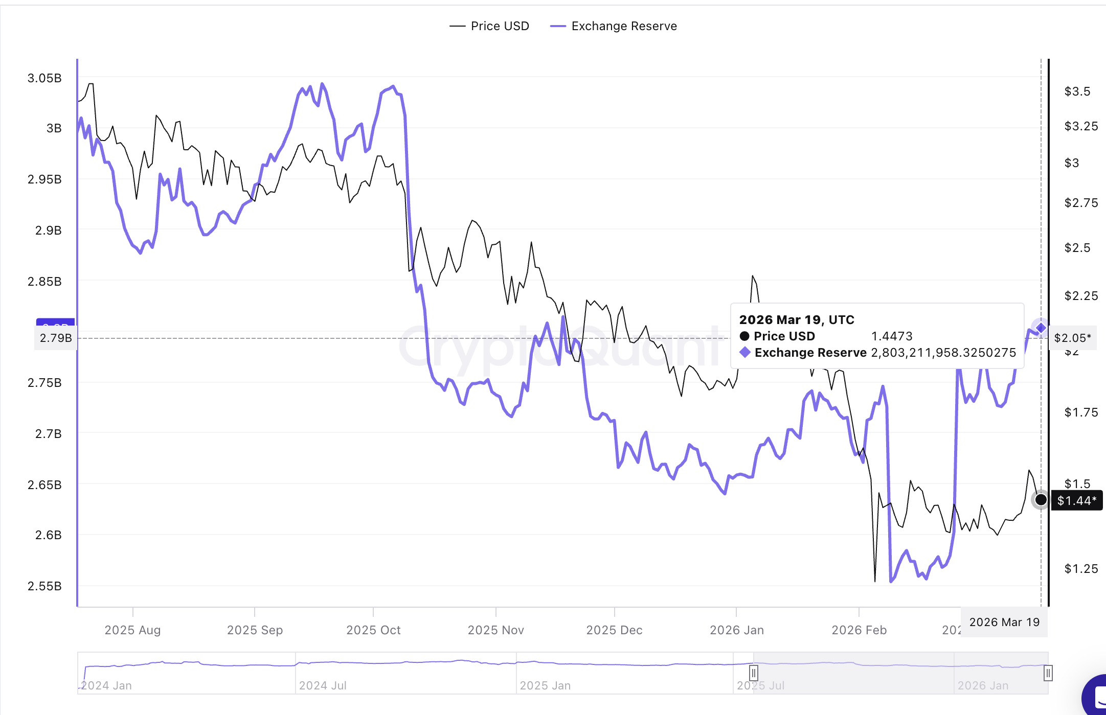 Đồng thời, những người nắm giữ XRP đang ngày càng chuyển tài sản của họ lên các sàn giao dịch, điều này đặt ra rủi ro đáng kể cho triển vọng tăng giá trong ngắn hạn và trung hạn. Lượng dự trữ trên các sàn giao dịch đã tăng lên, vượt quá 2,8 tỷ XRP tính đến thứ Năm, từ 2,74 tỷ XRP vào ngày 1 tháng 3.