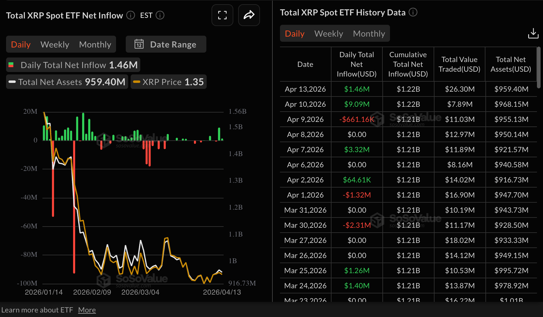 - Nhà đầu tư tổ chức thể hiện sự tự tin mới đối với các quỹ ETF XRP, với dòng tiền vào đạt 1,46 triệu $ vào thứ Hai.