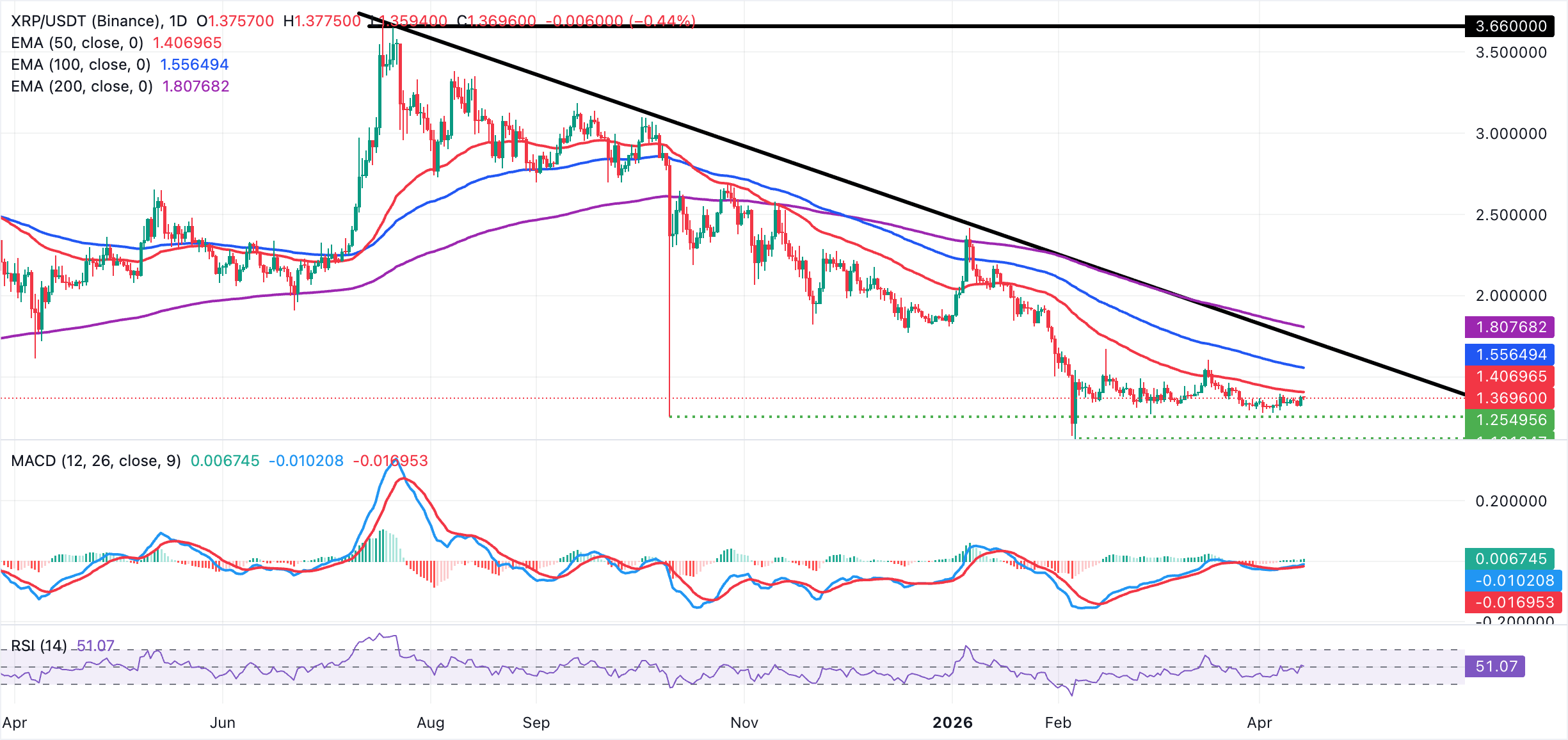 XRP giao dịch quanh mức 1,37$, duy trì xu hướng giảm ngắn hạn khi giữ dưới các đường trung bình động chính. Token chuyển tiền này bị giới hạn đầu tiên bởi Đường trung bình động hàm mũ (EMA) 50 ngày ở mức 1,41$, với EMA 100 ngày tại 1,56$ và EMA 200 ngày dài hạn hơn ở mức 1,81$ củng cố xu hướng giảm rộng hơn.