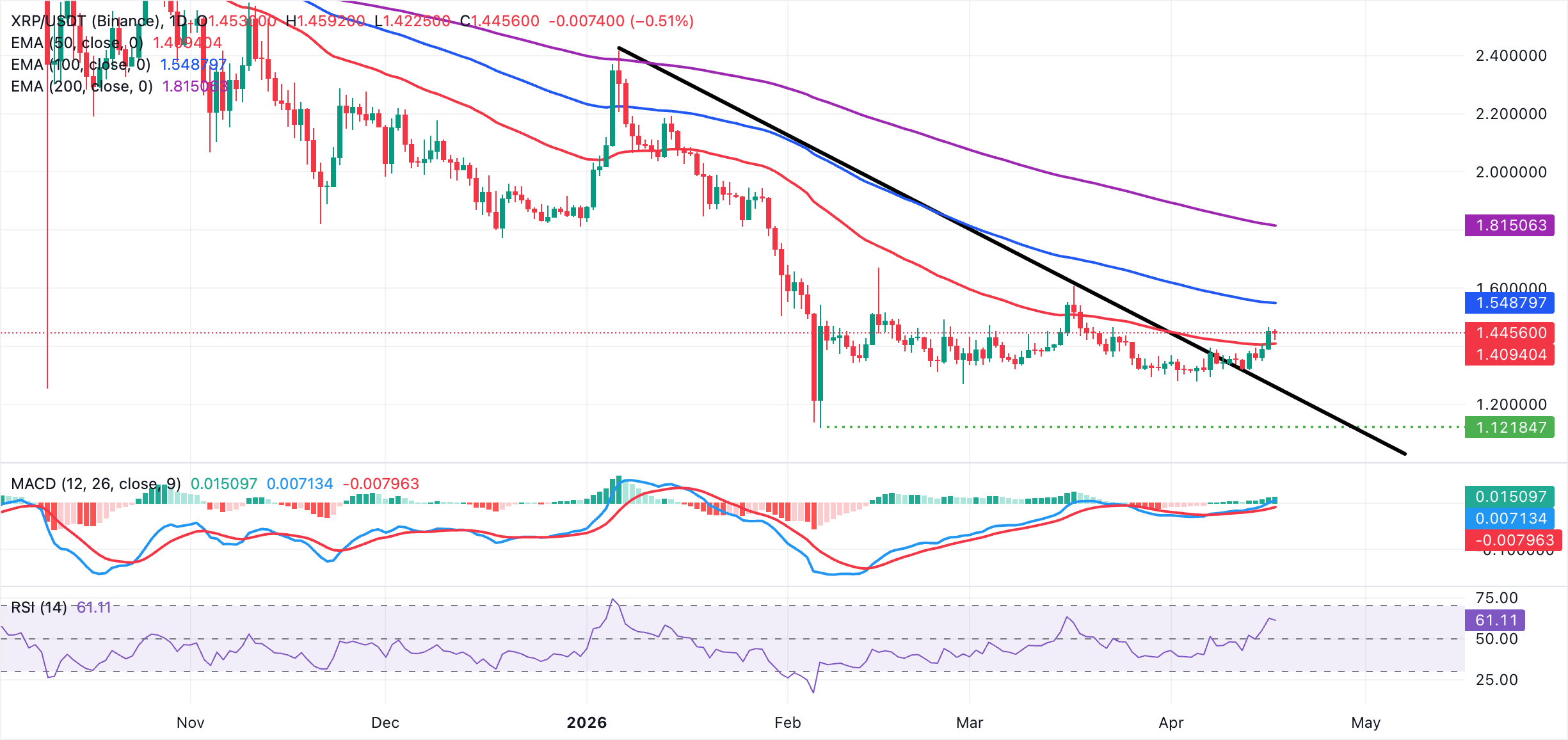 XRP giao dịch ở mức 1,44$ trong khi giữ trên đường trung bình động hàm mũ 50 ngày (EMA), cung cấp hỗ trợ tại 1,41$. Triển vọng kỹ thuật tổng thể gợi ý sắc thái tích cực ngắn hạn, nhưng vẫn thấp hơn nhiều so với EMA 100 ngày gần 1,55$ và EMA 200 ngày tại 1,82$, cả hai đều hạn chế đà phục hồi rộng hơn.