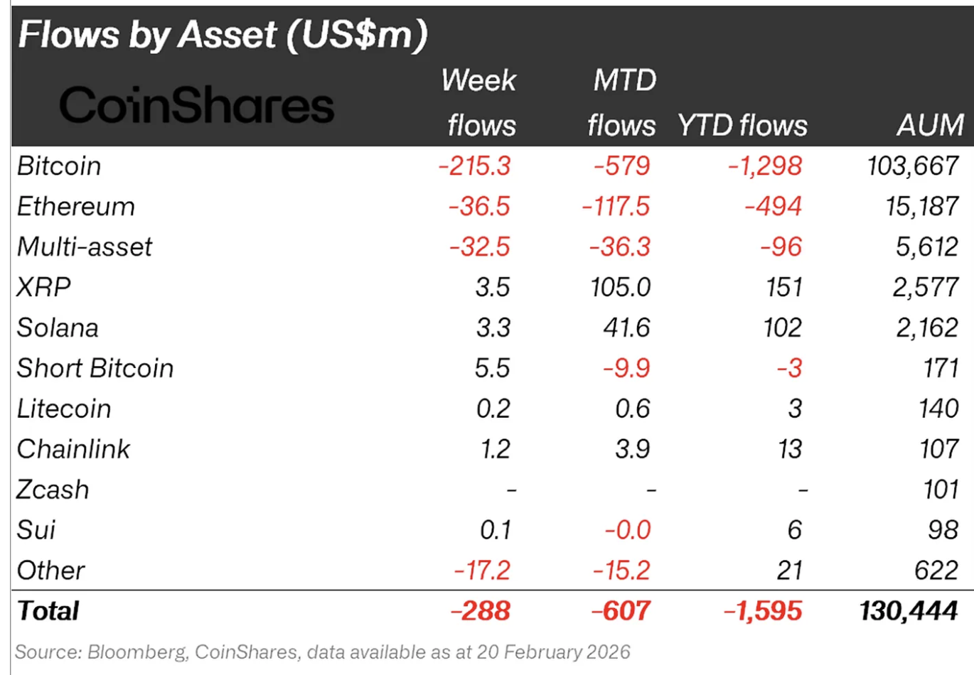 Trong khi đó, nhu cầu đối với các sản phẩm tài chính liên kết với Bitcoin vẫn ở mức thấp, với tổng dòng vốn chảy ra đạt 215 triệu USD trong tuần trước. Mặc dù đợt bán tháo đã kéo "Vua tiền điện tử" xuống dưới 65.000 USD, tổng tài sản được quản lý vẫn đạt 104 tỷ USD. Tuy nhiên, theo CoinShares, tổng dòng vốn chảy ra từ đầu năm đến nay trung bình là 1,3 tỷ USD.