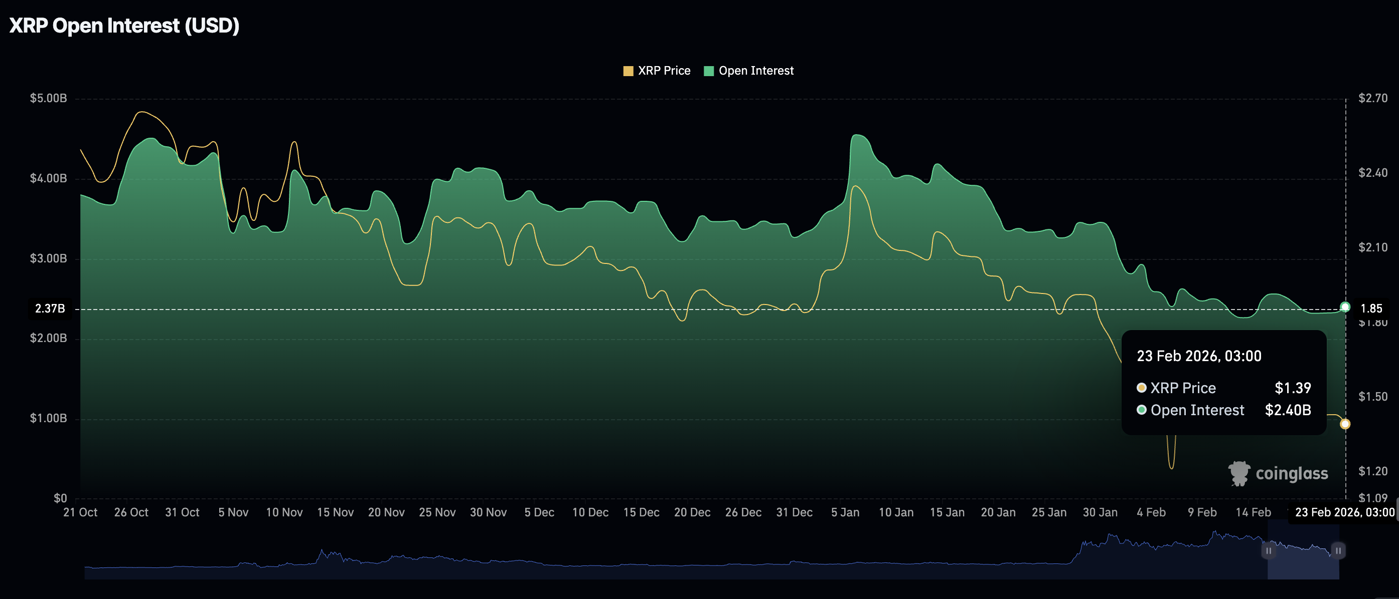 Về phía nhà đầu tư bán lẻ, các sản phẩm phái sinh XRP đang cho thấy sự ổn định, khi khối lượng giao dịch mở (OI) của hợp đồng tương lai tăng nhẹ lên 2,4 tỷ USD vào thứ Hai từ mức 2,33 tỷ USD của ngày hôm trước. Dữ liệu của CoinGlass khẳng định sự ổn định của OI, vốn đã duy trì trên mức 2,32 tỷ USD kể từ khi giảm xuống 2,56 tỷ USD vào ngày 16 tháng 2.