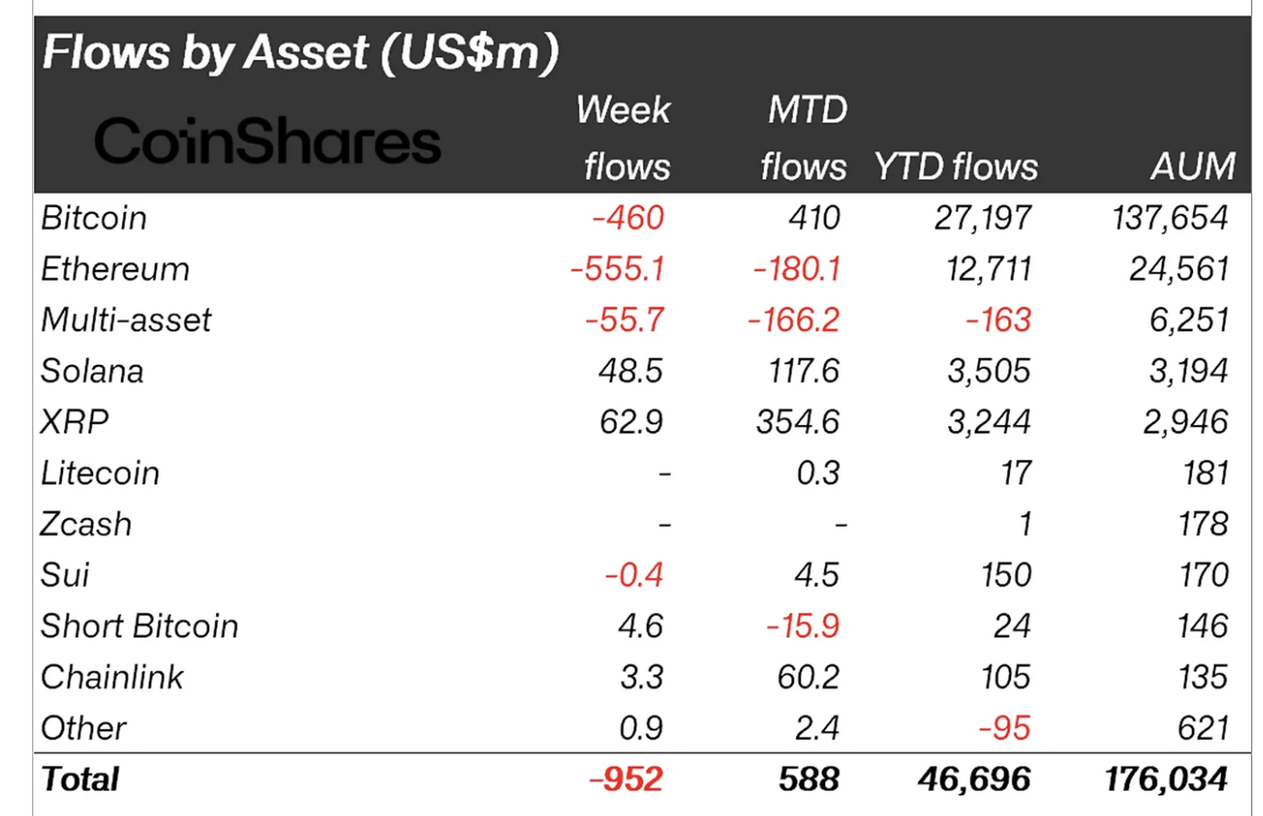 Các sản phẩm đầu tư tài sản kỹ thuật số chứng kiến dòng vốn chảy ra 952 triệu đô la, dẫn đầu là Ethereum (ETH) với 555 triệu đô la và Bitcoin (BTC) với 460 triệu đô la. Tuy nhiên, XRP vẫn duy trì triển vọng tăng giá, thu hút gần 63 triệu đô la vốn đầu tư, theo báo cáo của CoinShares. Các sản phẩm đầu tư XRP hiện đang quản lý tổng tài sản trị giá 2,95 tỷ đô la.