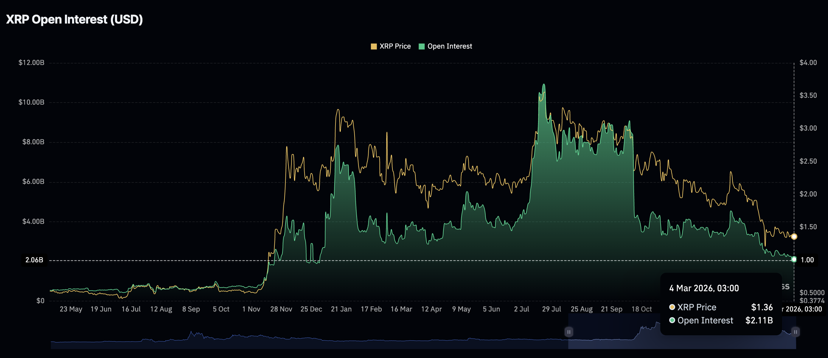 Thị trường phái sinh XRP phù hợp với xu hướng giảm chung, khi lãi suất mở (OI) của hợp đồng tương lai giảm xuống 2,11 tỷ USD vào thứ Tư, từ 2,25 tỷ USD của ngày trước đó.