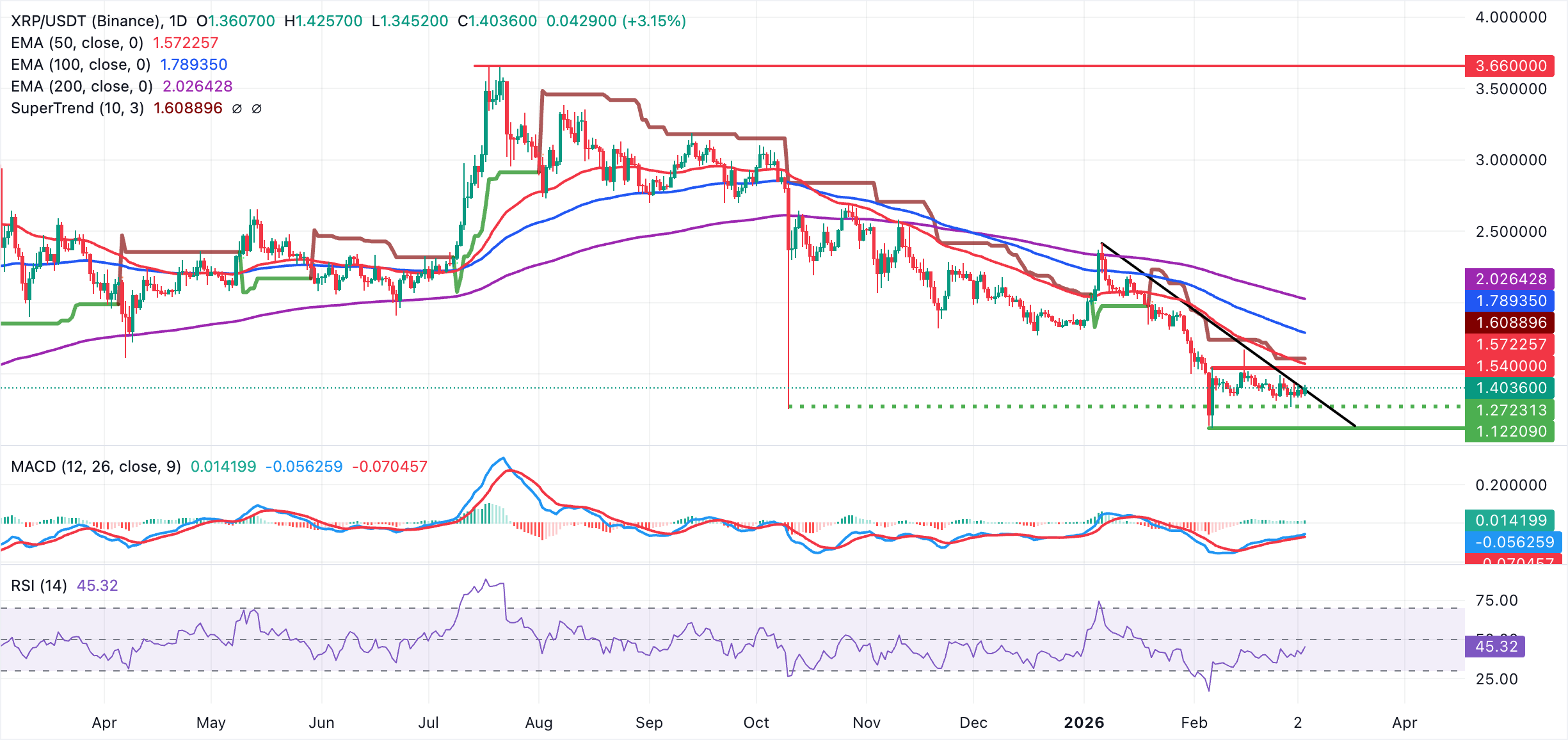 XRP đã tăng lên giữ trên mức 1,40$ từ mức thấp hàng ngày 1,35$, với tâm lý ngắn hạn vẫn hơi giảm giá. Giá giữ dưới các đường trung bình động hàm mũ (EMA) 50 ngày, 100 ngày và 200 ngày, tiếp tục dốc xuống và tạo thành một xu hướng giảm rộng. Hơn nữa, chỉ báo SuperTrend vẫn ở trên mức 1,61$, củng cố xu hướng giảm tổng thể mặc dù sự ổn định gần đây trên đường kháng cự giảm – hiện đã chuyển thành hỗ trợ ngay lập tức.