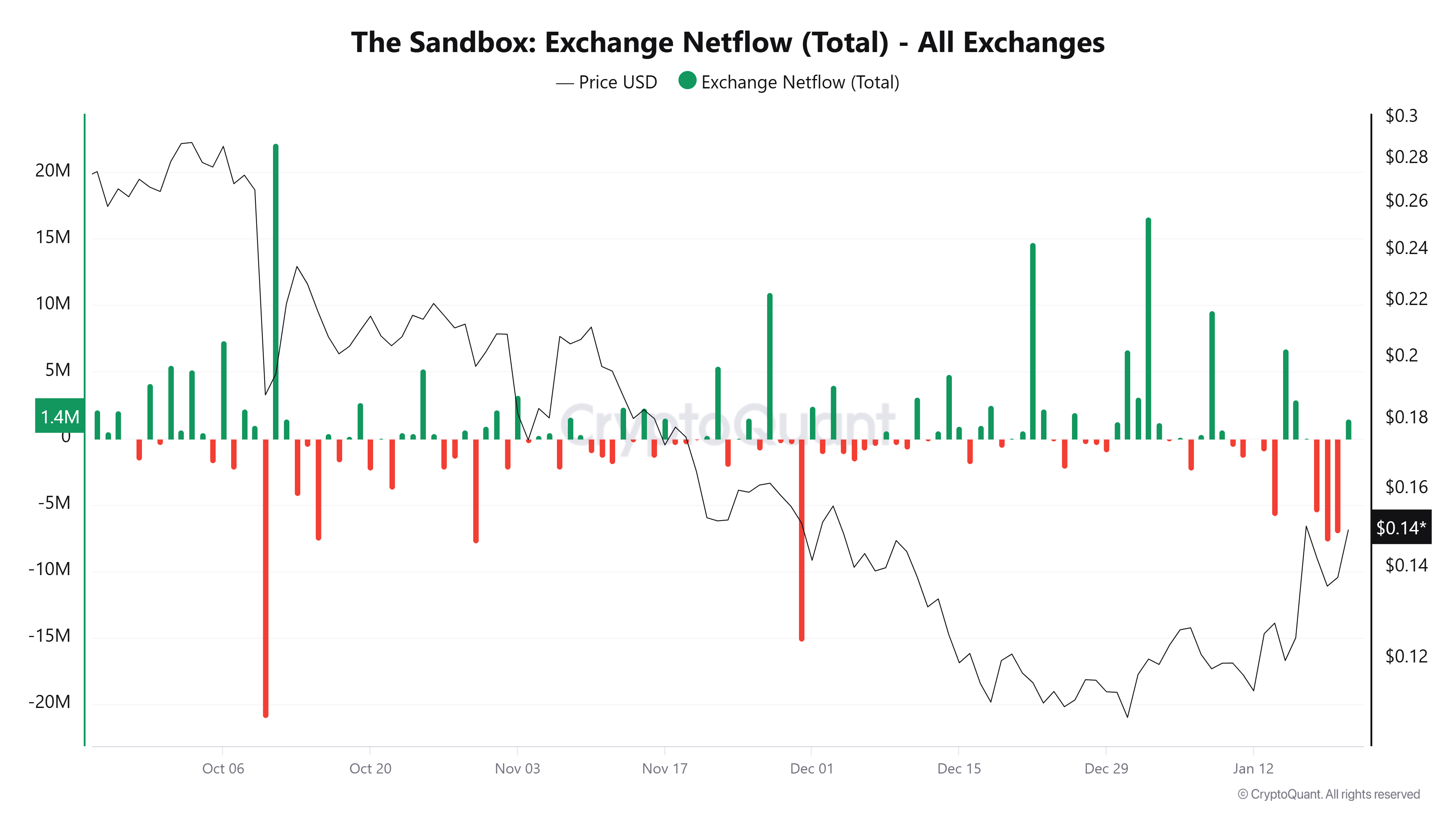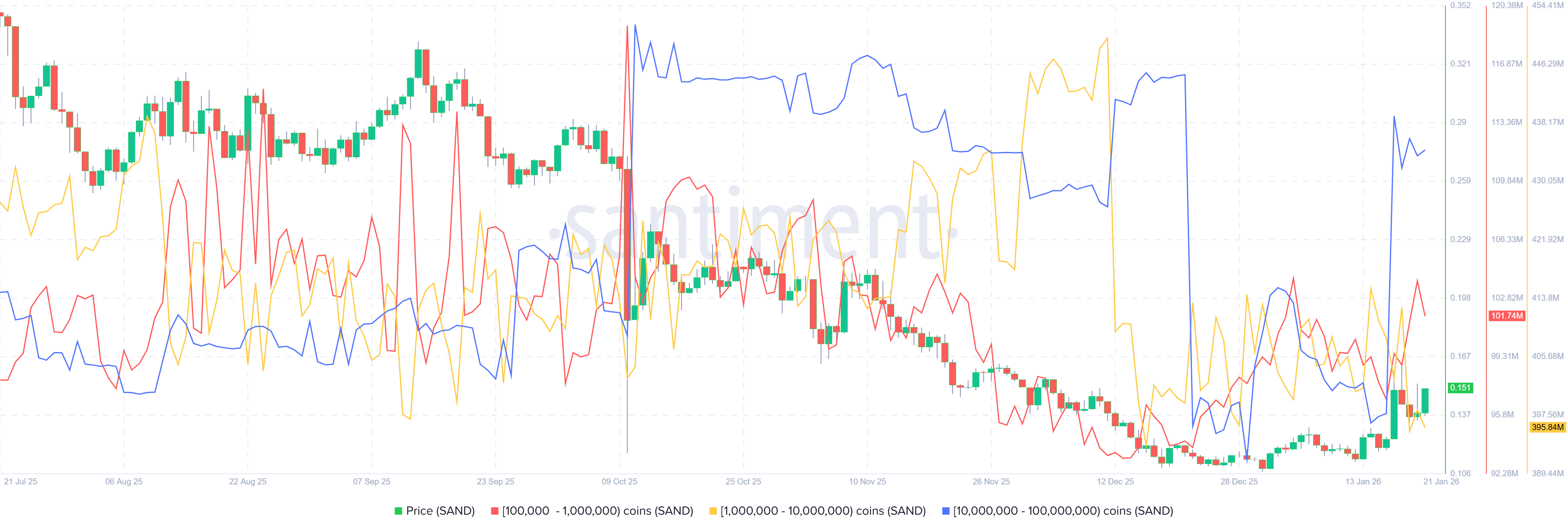 Số liệu cho thấy các nhà đầu tư lớn (cá voi) nắm giữ từ 10 triệu đến 100 triệu token SAND (đường màu xanh) và từ 100.000 đến 1 triệu token SAND (đường màu đỏ) đã tích lũy tổng cộng 94,39 triệu token từ ngày 15 tháng 1 đến thứ Tư. Trong cùng kỳ, các ví nắm giữ từ 1 triệu đến 10 triệu token SAND (đường màu vàng) đã bán ra 14,87 triệu token.
