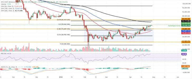 Giá Bitcoin đang giao dịch trên mức 79.000 đô la vào thứ Hai, duy trì xu hướng tăng trong ngắn hạn khi giá giữ vững trên các đường EMA 50 ngày và 100 ngày ở mức 73.421 đô la và 75.667 đô la. BTC cũng đã vượt qua mức thoái lui 50% ở mức 78.962 đô la. Đà tăng vẫn tích cực, với chỉ số sức mạnh tương đối (RSI) trên biểu đồ hàng ngày dao động trong vùng tăng giá quanh mức 66, trong khi chỉ báo MACD vẫn nằm trong vùng tích cực, cho thấy áp lực mua vẫn chiếm ưu thế mặc dù có sự giảm nhẹ so với mức cao gần đây.