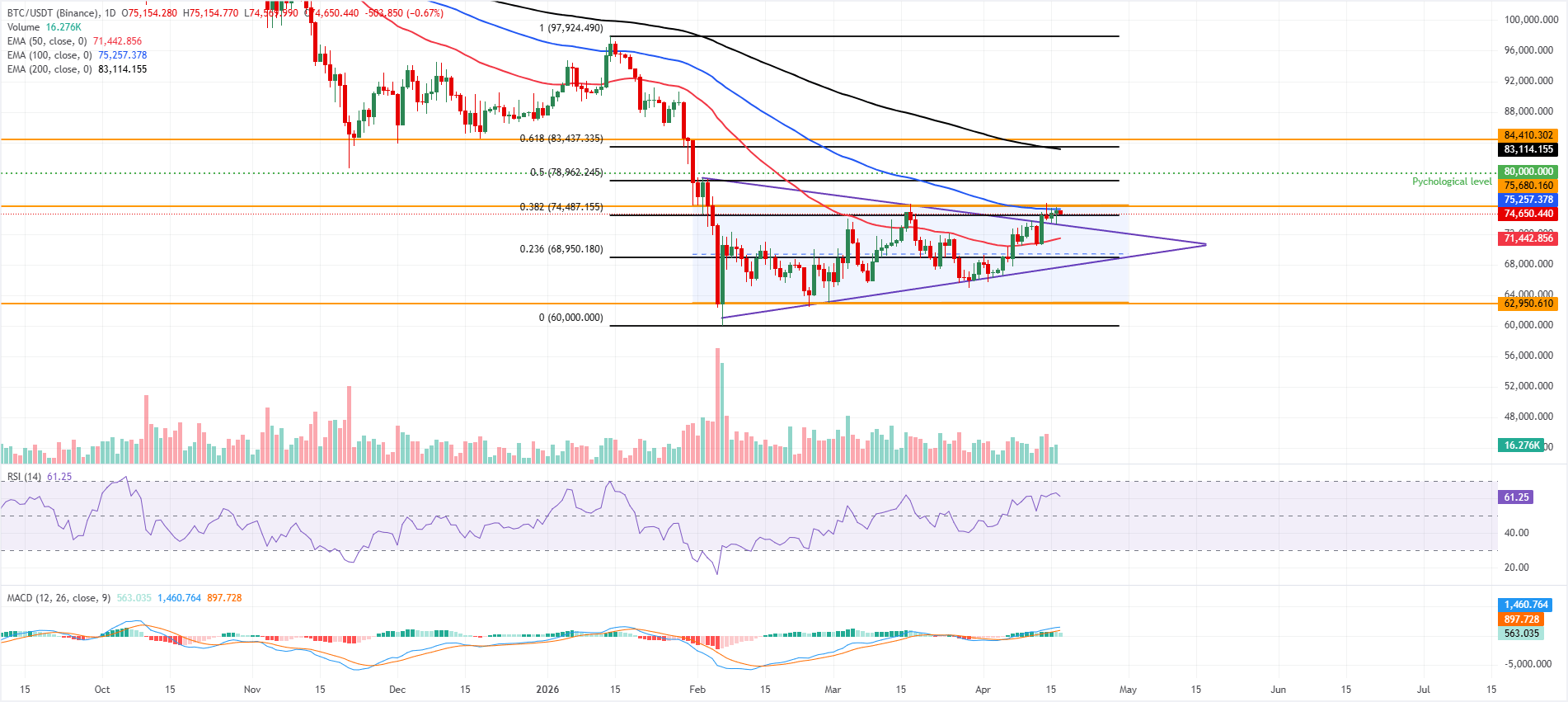 - Bitcoin gặp kháng cự tại đường EMA 100 ngày quanh mức 75.260 đô la sau khi tăng hơn 5% trong tuần này.