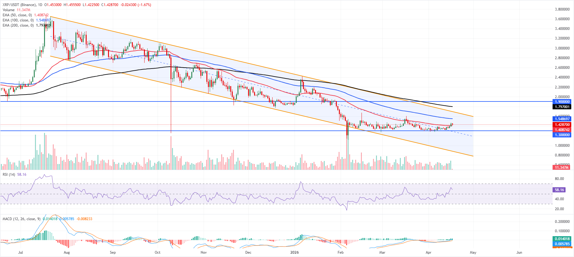 Giá XRP đang giao dịch giảm nhẹ ở mức khoảng 1,42 đô la vào thứ Sáu, sau khi tăng hơn 7%. XRP giữ vững trên đường EMA 50 ngày ở mức 1,40 đô la, cho thấy xu hướng tích cực nhẹ trong ngắn hạn, nhưng vẫn bị kìm hãm tốt dưới đường EMA 100 ngày ở mức 1,54 đô la và mức trần của kênh giá song song giảm rộng hơn gần 1,69 đô la, điều này duy trì cấu trúc giảm giá trung hạn.