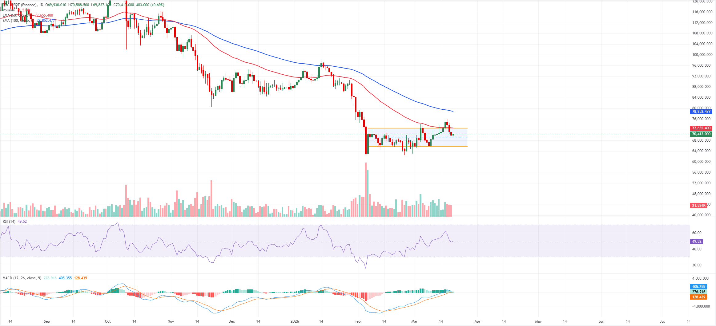 Kháng cự ban đầu trùng với đỉnh kênh gần 72.600 USD, và đường EMA 50 ngày gần như hội tụ tại đó, tạo thành một rào cản mạnh hơn. Giá đóng cửa hàng ngày trên mức hợp lưu này sẽ mở đường hướng tới đường EMA 100 ngày gần 78.800 USD.