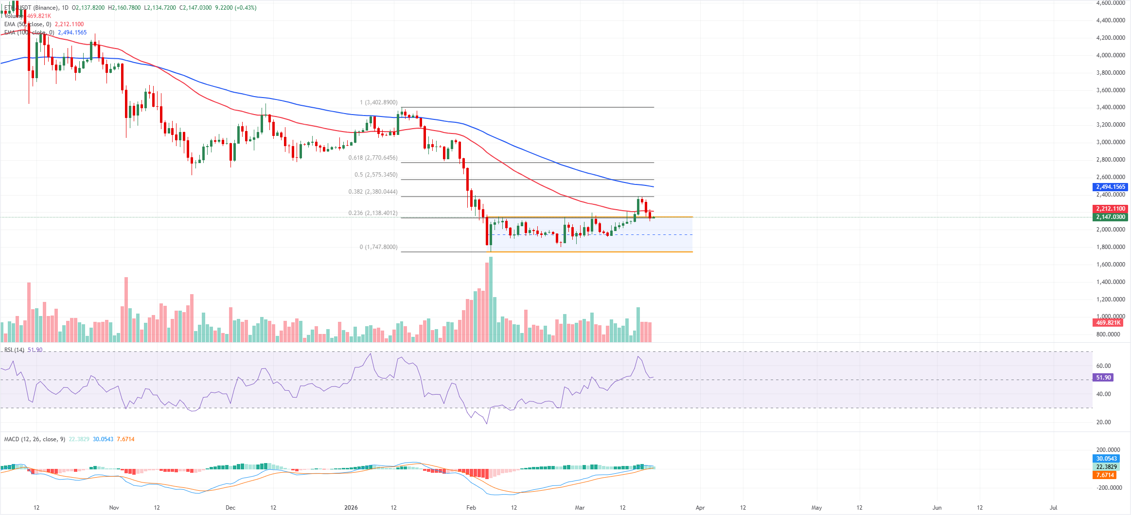 Giá Ethereum đang giao dịch ở mức 2.140 đô la vào thứ Sáu. Xu hướng ngắn hạn hơi giảm nhẹ khi giá giữ ngay dưới ranh giới trên của một kênh song song, đạt đỉnh gần 2.148 đô la, trong khi giá đóng cửa hàng ngày vẫn thấp hơn nhiều so với đường EMA 50 ngày và 100 ngày, lần lượt nằm trên mức 2.200 đô la và 2.490 đô la.