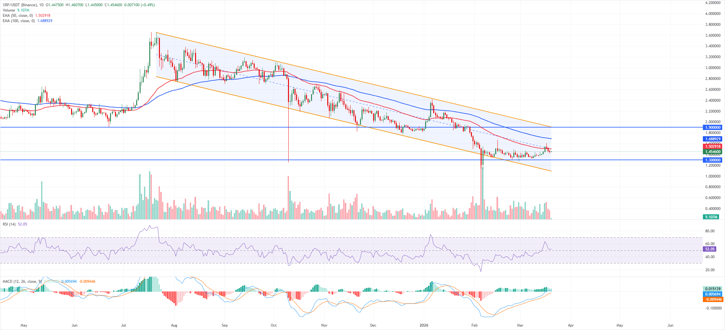 Giá XRP đang giao dịch ở mức 1,45 đô la vào thứ Sáu. Xu hướng ngắn hạn vẫn trung lập với một chút nghiêng về giảm giá khi giá nằm trong một kênh song song giảm dần rộng hơn, kênh này đã dẫn dắt các đỉnh thấp hơn từ trên 2,80 đô la xuống khu vực giữa 1,00 đô la.