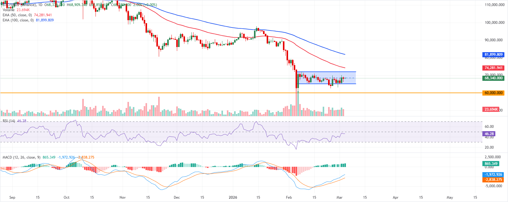 Giá Bitcoin đang giao dịch trong phạm vi củng cố quanh mức 68.300$ tính đến thứ Tư. Xu hướng ngắn hạn có phần lạc quan trong một kênh song song rộng hơn, khi giá giữ trên khu vực giữa của cấu trúc, bị giới hạn gần 71.980$ và được hỗ trợ quanh 65.120$. Crypto King giao dịch dưới mức trung bình động hàm mũ (EMA) 50 và 100 ngày, tập trung ở giữa mức 80.000$, nhưng đường trung bình động hội tụ phân kỳ (MACD) trên biểu đồ hàng ngày đứng trên đường tín hiệu và vẫn trong vùng tích cực, với một biểu đồ dương, cho thấy đà tăng đang cải thiện trong bối cảnh yếu kém trung hạn.