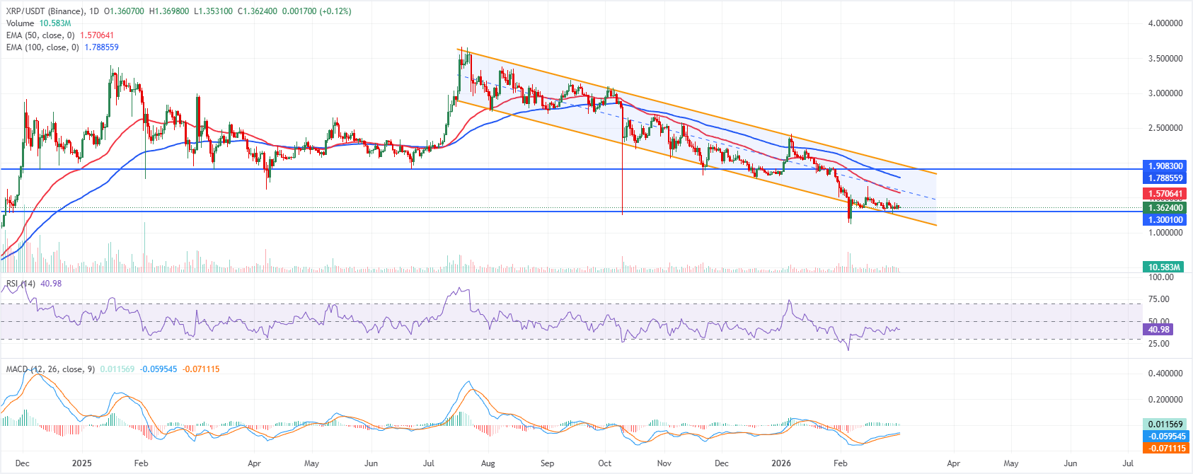 Giá XRP đang giao dịch quanh mức 1,36$ tính đến thời điểm viết bài vào thứ Tư. Cặp tiền này vẫn bị khóa trong một kênh giảm dần từ trên 2,80$, giữ cho xu hướng ngắn hạn chung là giảm mặc dù gần đây đã ổn định trên ranh giới dưới gần 1,24.
