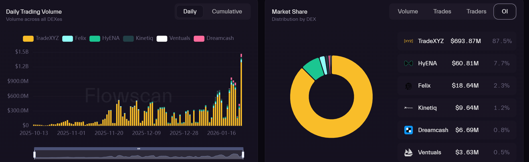 Phần lớn sự tăng trưởng nhu cầu mở và khối lượng giao dịch trên HIP-3 đến từ nền tảng TradeXYZ, cho phép giao dịch hàng hóa và cổ phiếu. Theo dữ liệu của Flowscan, nền tảng này đã ghi nhận khối lượng giao dịch hàng ngày là 1,29 tỷ đô la trong 24 giờ qua, với nhu cầu mở ở mức 693,8 triệu đô la tại thời điểm công bố.