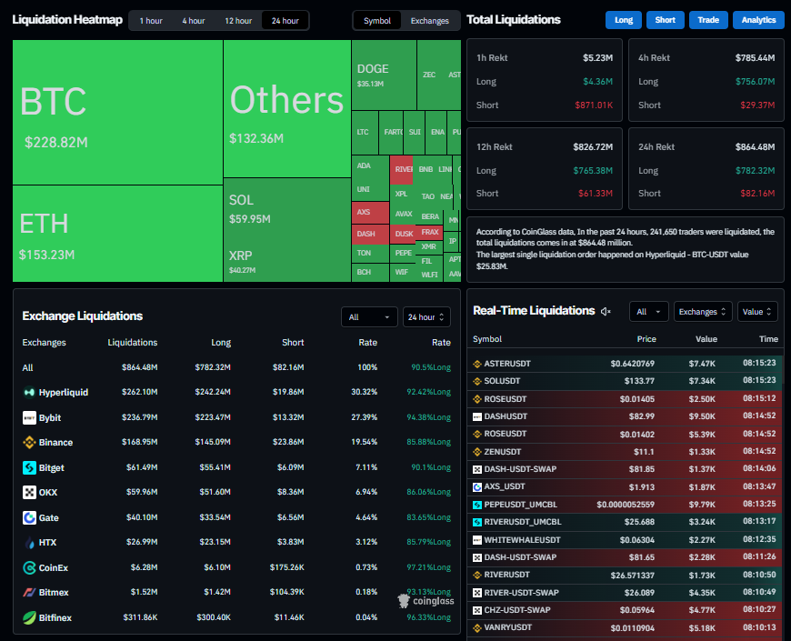 Đáng chú ý, 90,5% là các vị thế mua, cho thấy vị thế lạc quan thái quá của thị trường. Vụ thanh lý lớn nhất xảy ra trên Hyperliquid, nơi một vị thế BTCUSDT trị giá 25,83 triệu đô la đã bị thanh lý.