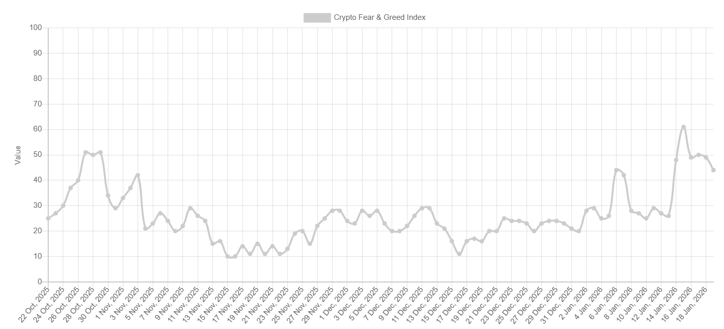 Chỉ số Sợ hãi và Tham lam giảm xuống 44 vào thứ Hai từ mức cao nhất là 61 vào thứ Năm, báo hiệu sự chuyển dịch từ lạc quan sang tâm lý thị trường thận trọng hơn.