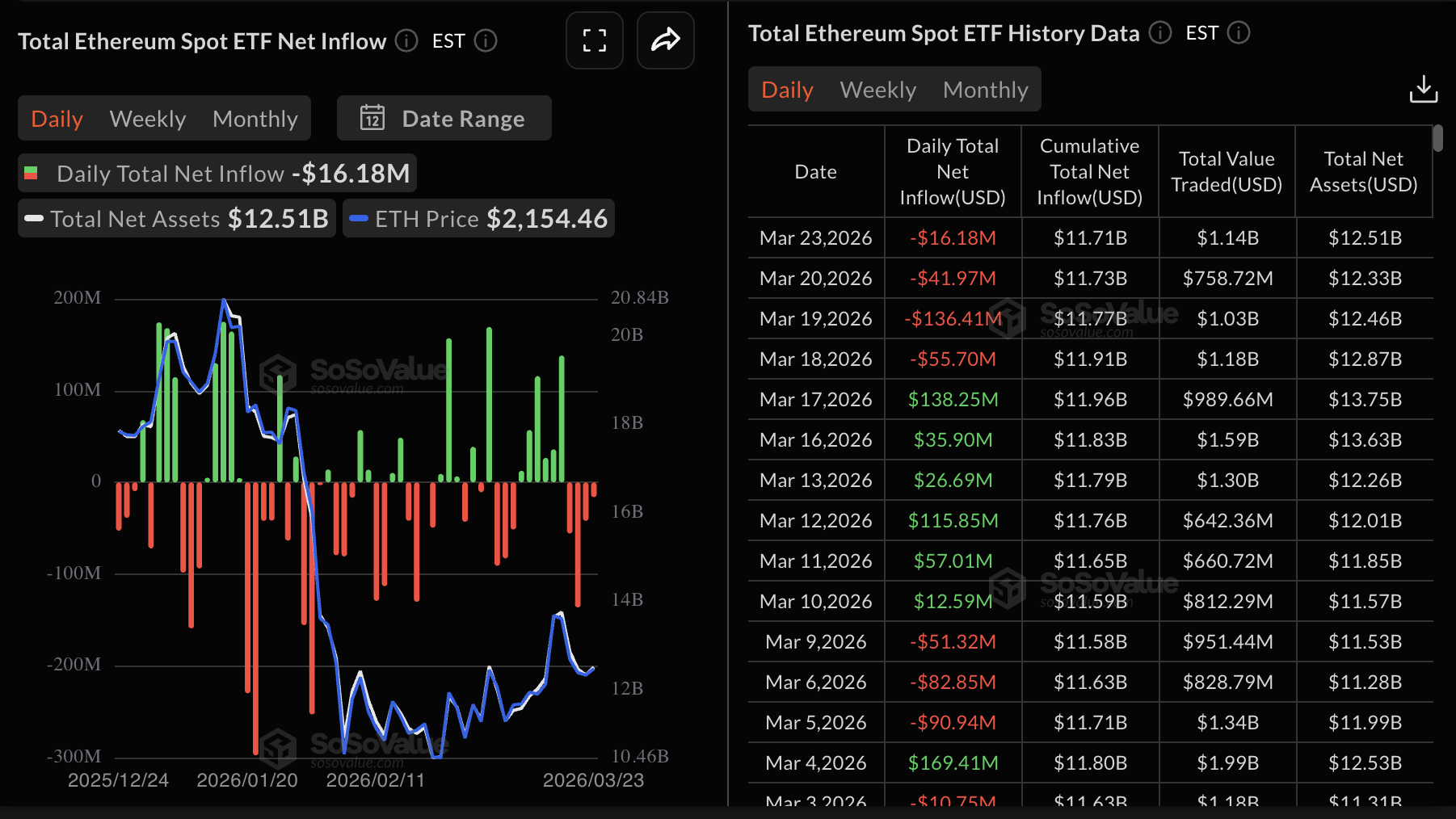 Ethereum tiếp tục đối mặt với tình trạng rút vốn dai dẳng từ các quỹ ETF giao ngay. Các quỹ ETF niêm yết tại Mỹ đã chứng kiến khoảng 16 triệu đô la dòng tiền chảy ra vào thứ Hai, kéo dài chuỗi giảm điểm trong ngày thứ tư liên tiếp. Dữ liệu của SoSoValue cho thấy tài sản ròng được quản lý trung bình đạt 12,51 tỷ USD trong khi dòng vốn tích lũy đạt 11,71 tỷ USD. Chuỗi dòng vốn chảy ra cho thấy khẩu vị rủi ro đối với các sản phẩm đầu tư Ethereum vẫn ở mức thấp, điều này có thể hạn chế sự phục hồi bền vững trong ngắn hạn và trung hạn.
