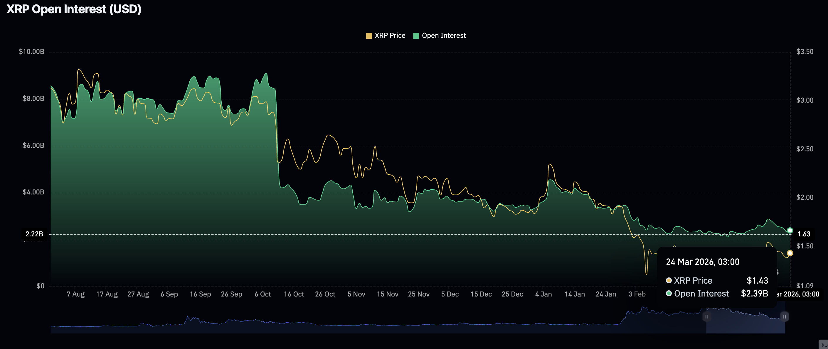 Sự quan tâm của nhà đầu tư cá nhân đối với XRP vẫn đang ở mức thấp, thể hiện qua số lượng hợp đồng mở trong hợp đồng tương lai, chỉ ở mức 2,39 tỷ USD vào thứ Ba. Nhìn lại, OI hợp đồng tương lai XRP trung bình đạt 10,94 tỷ USD vào tháng 7, trùng với mức cao kỷ lục 3,66 USD. Khoảng cách lớn này cho thấy các nhà đầu tư thiếu tự tin vào khả năng duy trì đà tăng của XRP, điều này có thể giải thích lý do cần giảm bớt tỷ trọng nắm giữ.