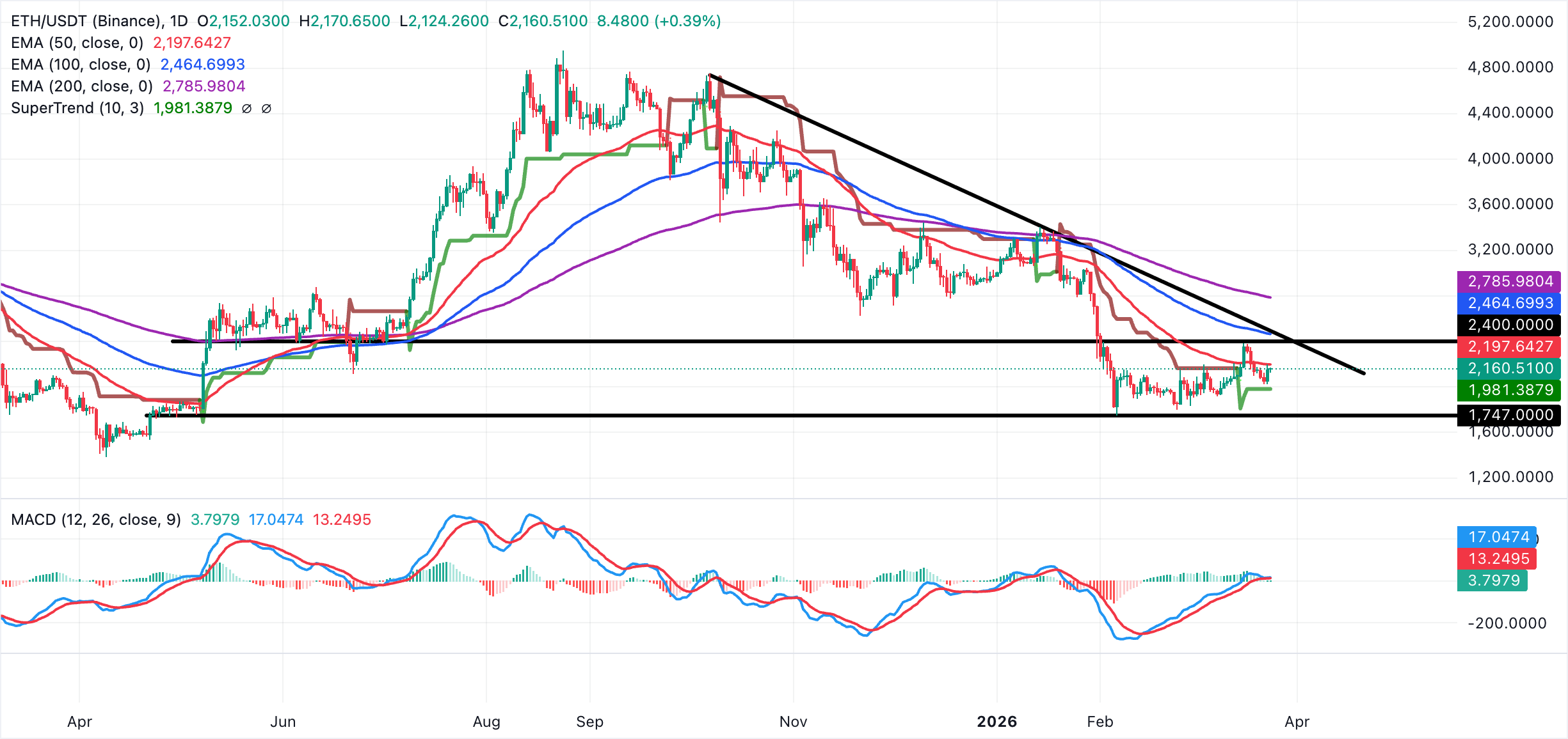 Ethereum đang giữ vững trên mức 2.100 đô la trong bối cảnh xu hướng trung lập ngắn hạn. Tín hiệu mua của chỉ báo SuperTrend và mức hỗ trợ động ở mức 1.981 đô la phù hợp với khả năng đảo chiều tăng giá. Tuy nhiên, nến ngày vẫn nằm dưới các đường EMA 50 ngày, 100 ngày và 200 ngày, tập trung trong khoảng từ 2.197 đô la đến 2.786 đô la, cho thấy xu hướng chủ đạo vẫn mang tính điều chỉnh ngay cả khi động lượng giảm giá đang yếu dần.