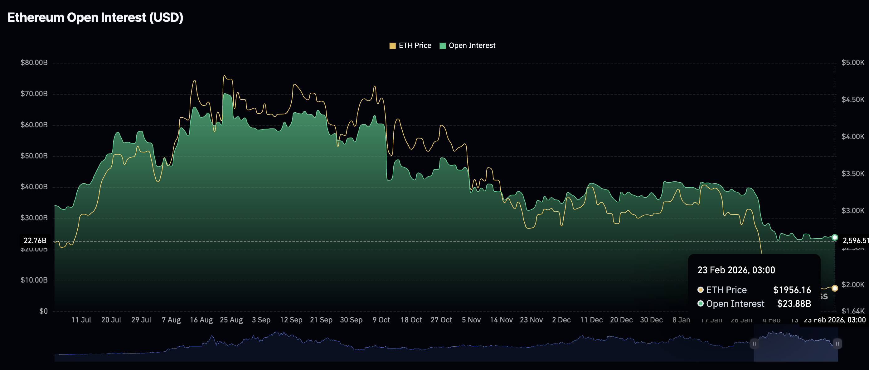 Ethereum đang đối mặt với sự sụt giảm đều đặn về sự quan tâm của nhà đầu tư cá nhân, với khối lượng giao dịch mở (OI) trên thị trường tương lai giảm xuống còn 23,88 tỷ USD vào thứ Hai từ mức 24,22 tỷ USD của ngày hôm trước. Sau khi OI của thị trường tương lai ETF đạt đỉnh 70,13 tỷ USD vào tháng 8, đợt bán tháo từ mức cao kỷ lục 4.956 USD vẫn chưa hạ nhiệt.