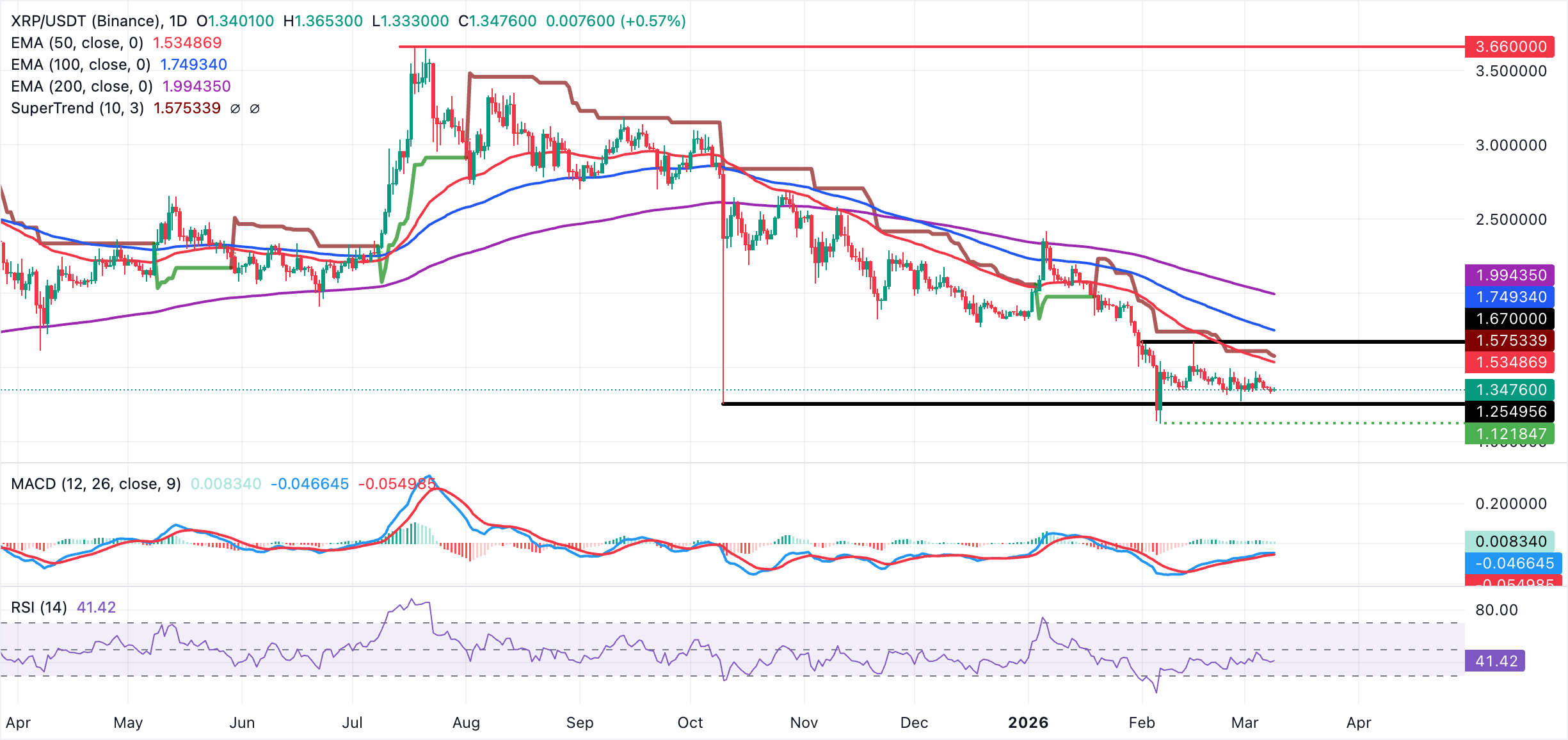 Đối với XRP, phe bò đang kiểm soát phần nào, khi giá dao động quanh mức 1,35 đô la vào thời điểm viết bài hôm thứ Hai. Mặc dù đã tăng từ mức thấp nhất trong ngày ở mức 1,33 đô la, xu hướng ngắn hạn vẫn hơi giảm, vì đà tăng bị chặn bởi đường EMA 50 ngày ở mức 1,53 đô la, chỉ báo SuperTrend ở mức 1,57 đô la và đường EMA 100 ngày ở mức 1,75 đô la.