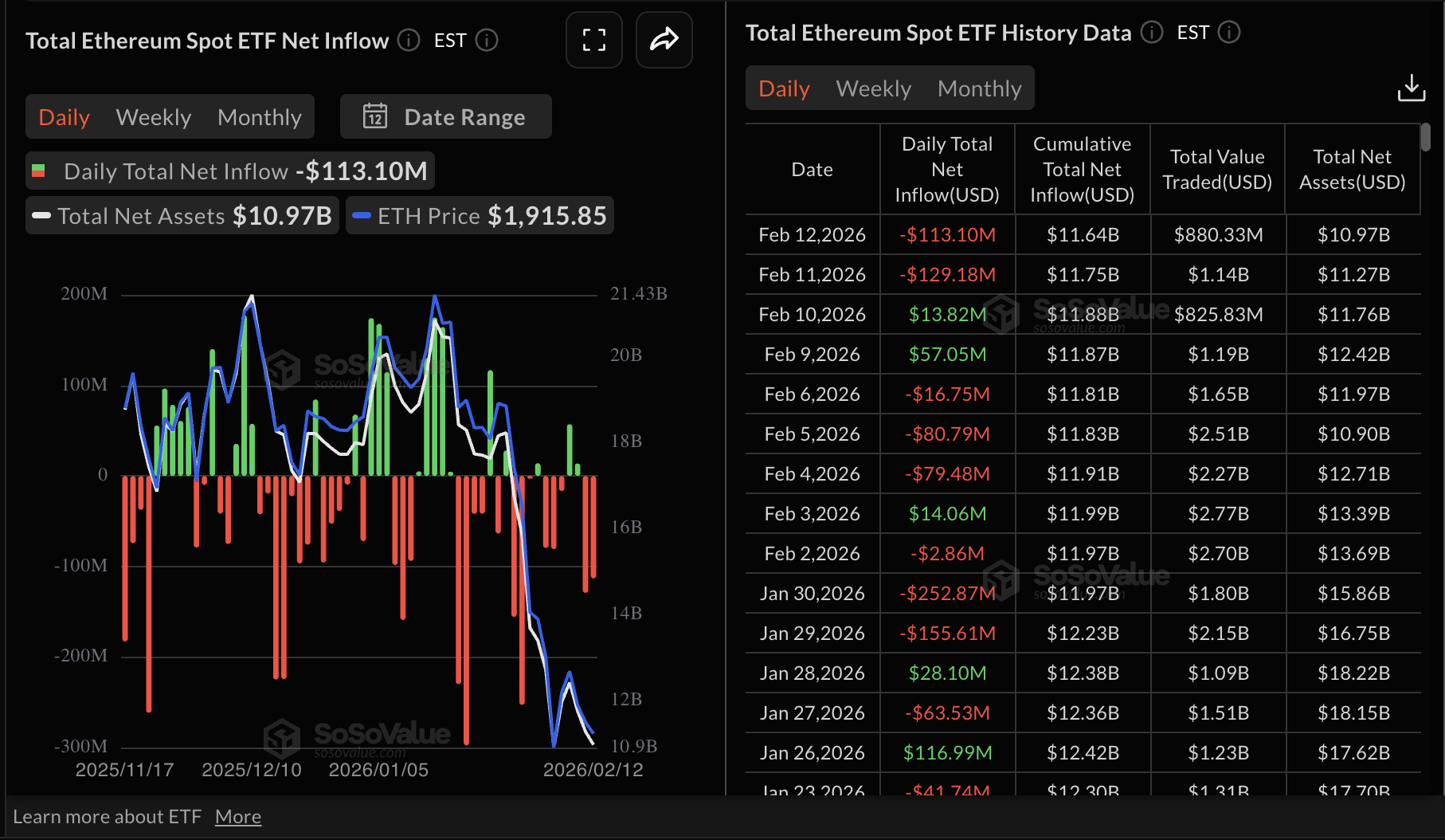 Ethereum cũng tiếp tục dòng tiền chảy ra vào thứ Năm, khi các nhà đầu tư rút hơn 113 triệu đô la từ các quỹ ETF giao ngay. Điều này đánh dấu ngày thứ hai liên tiếp dòng tiền chảy ra, sau 129 triệu đô la vào thứ Tư. Tổng dòng tiền chảy vào hiện ở mức 11,64 tỷ đô la và tài sản ròng ở mức 10,97 tỷ đô la.