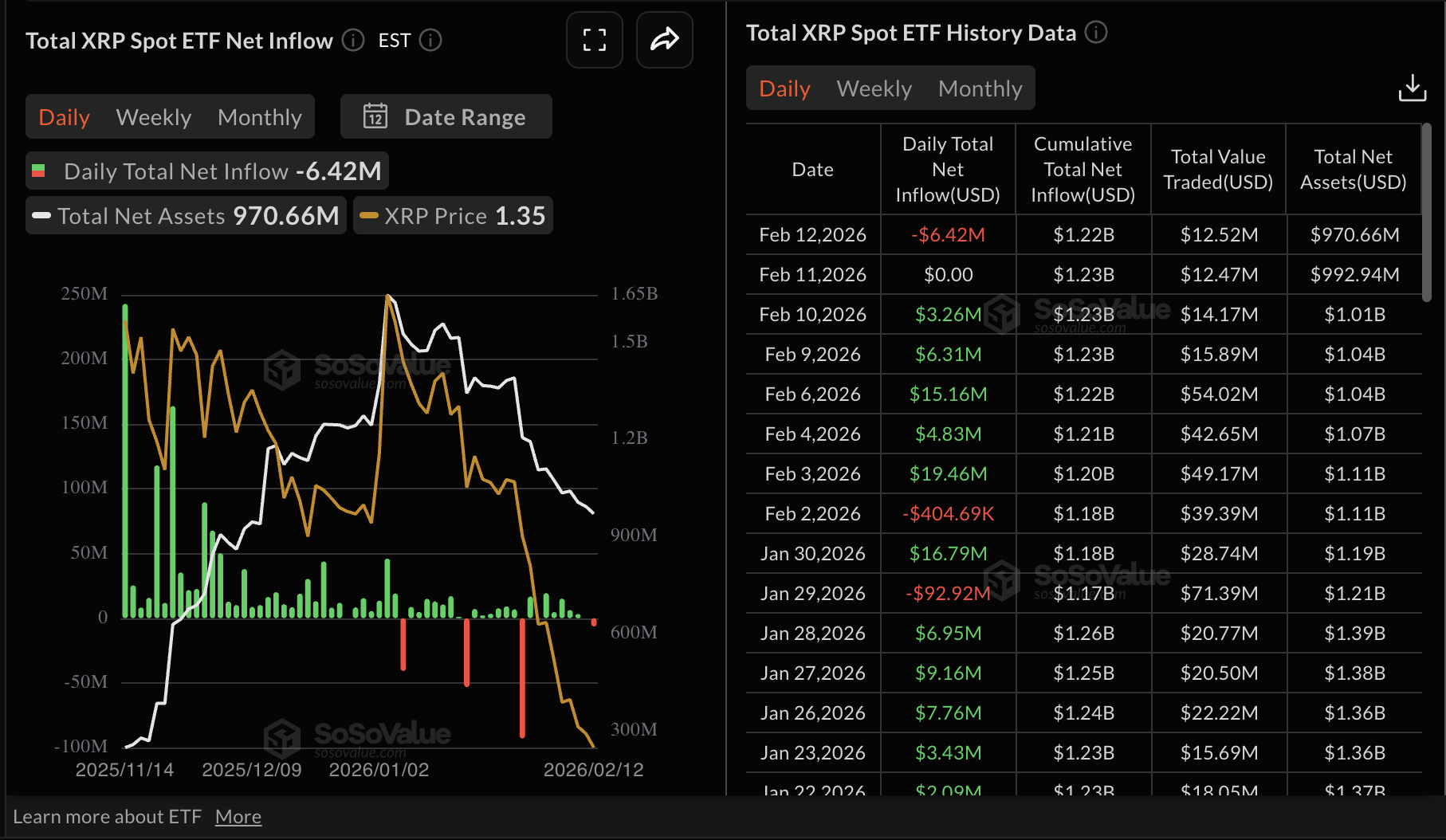 Trong khi đó, tâm lý xung quanh XRP tiếp tục giảm, với dòng vốn chảy ra đạt khoảng 6,4 triệu đô la vào thứ Năm sau dòng vốn giảm nhẹ vào thứ Tư. Mặc dù có dòng vốn chảy ra vào thứ Năm, tổng dòng vốn chảy vào vẫn đạt 1,22 tỷ đô la với tài sản ròng ở mức 971 triệu đô la.