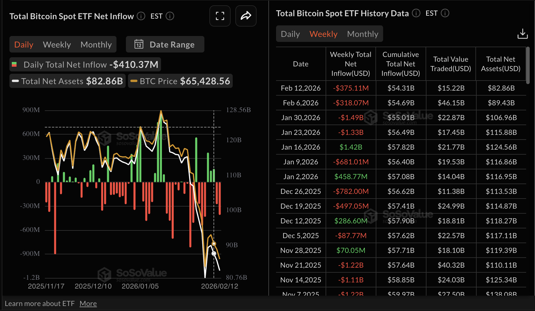 Theo dữ liệu của SoSoValue, các quỹ ETF Bitcoin có khả năng ghi nhận bốn tuần liên tiếp dòng tiền chảy ra (đang chờ dữ liệu vào thứ Sáu), đẩy tổng dòng tiền chảy vào lên 54,31 tỷ đô la và tài sản ròng được quản lý lên 82,86 tỷ đô la. Các nhà đầu tư đã rút khoảng 410 triệu đô la từ các quỹ ETF BTC giao ngay niêm yết tại Mỹ vào thứ Năm.